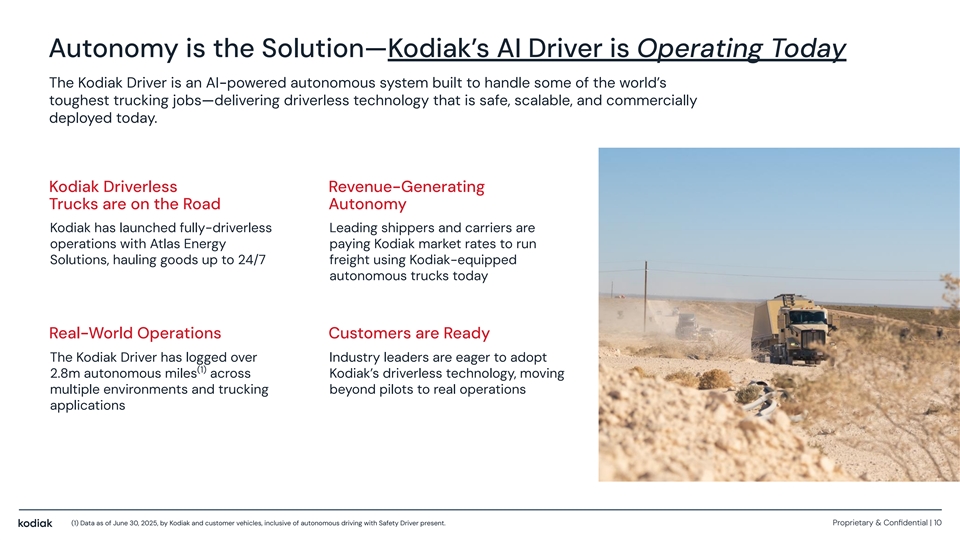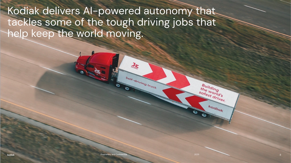 Kodiak delivers AI-powered autonomy that tackles some of the tough driving jobs that help keep the world moving. a Proprietary and Confidential 2025 8