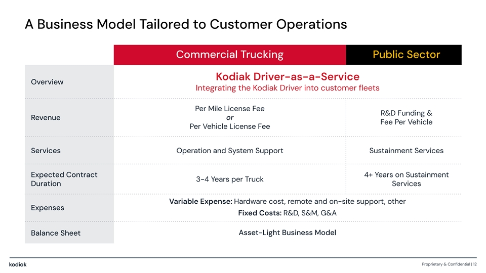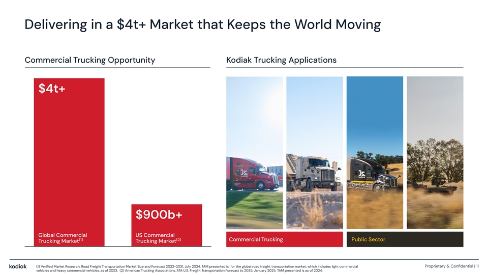 Delivering in a $4t+ Market that Keeps the World Moving Commercial Trucking Opportunity Kodiak Trucking Applications $4t+ $900b+ Global Commercial US Commercial (1) (2) Commercial Trucking Public Sector Trucking Market Trucking Market (1) Verified Market Research, Road Freight Transportation Market Size and Forecast 2023-2031, July 2024. TAM presented is for the global road freight transportation market, which includes light commercial Proprietary & Confidential | 11 vehicles and heavy commercial vehicles, as of 2023. (2) American Trucking Associations, ATA U.S. Freight Transportation Forecast to 2035, January 2025. TAM presented is as of 2024.