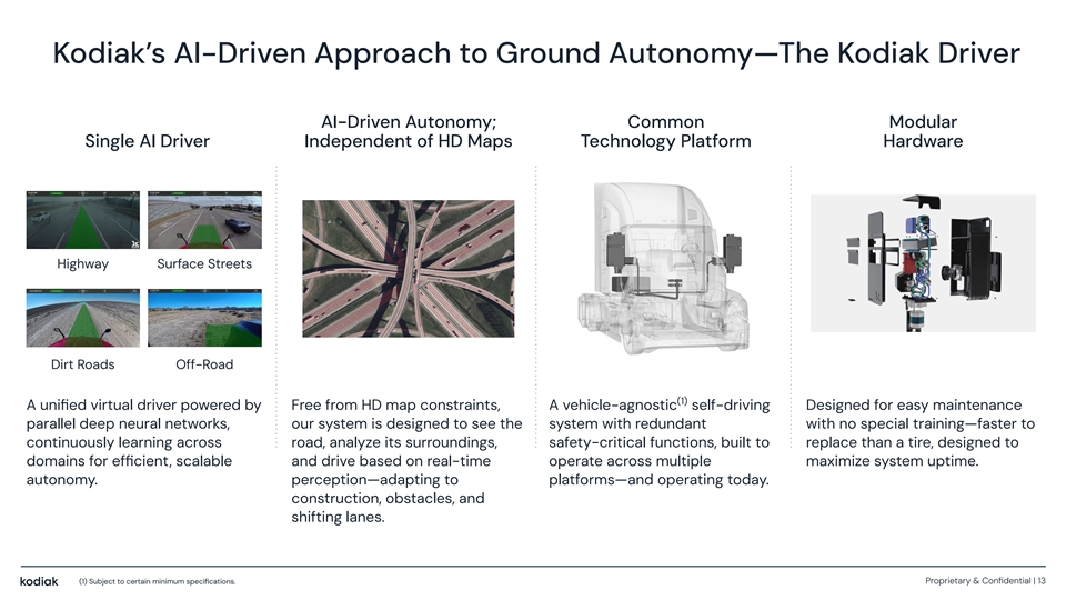 A Business Model Tailored to Customer Operations Commercial Trucking Public Sector Kodiak Driver-as-a-Service Overview Integrating the Kodiak Driver into customer fleets Per Mile License Fee R&D Funding & Revenue or Fee Per Vehicle Per Vehicle License Fee Services Operation and System Support Sustainment Services Expected Contract 4+ Years on Sustainment 3-4 Years per Truck Duration Services Variable Expense: Hardware cost, remote and on-site support, other Expenses Fixed Costs: R&D, S&M, G&A Asset-Light Business Model Balance Sheet Proprietary & Confidential | 12