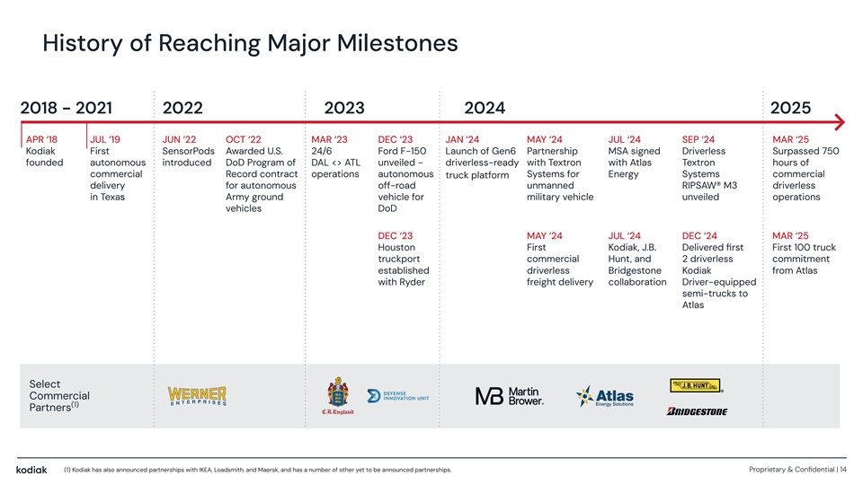 Kodiak’s AI-Driven Approach to Ground Autonomy—The Kodiak Driver AI-Driven Autonomy; Common Modular Single AI Driver Independent of HD Maps Technology Platform Hardware Highway Surface Streets Dirt Roads Off-Road (1) A unified virtual driver powered by Free from HD map constraints, A vehicle-agnostic self-driving Designed for easy maintenance parallel deep neural networks, our system is designed to see the system with redundant with no special training—faster to continuously learning across road, analyze its surroundings, safety-critical functions, built to replace than a tire, designed to domains for efficient, scalable and drive based on real-time operate across multiple maximize system uptime. autonomy. perception—adapting to platforms—and operating today. construction, obstacles, and shifting lanes. (1) Subject to certain minimum specifications. Proprietary & Confidential | 13