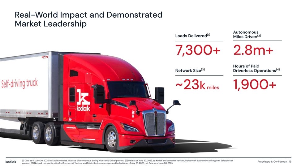 History of Reaching Major Milestones 2018 - 2021 2022 2023 2024 2025 APR ‘18 JUL ’19 JUN ‘22 OCT ‘22 MAR ‘23 DEC ‘23 JAN ‘24 MAY ‘24 JUL ‘24 SEP ‘24 MAR ‘25 Kodiak First SensorPods Awarded U.S. 24/6 Ford F-150 Launch of Gen6 Partnership MSA signed Driverless Surpassed 750 founded autonomous introduced DoD Program of DAL <> ATL unveiled - driverless-ready with Textron with Atlas Textron hours of commercial Record contract operations autonomous Systems for Energy Systems commercial truck platform delivery for autonomous off-road unmanned RIPSAW® M3 driverless in Texas Army ground vehicle for military vehicle unveiled operations vehicles DoD DEC ‘23 MAY ‘24 JUL ‘24 DEC ‘24 MAR ‘25 Houston First Kodiak, J.B. Delivered first First 100 truck truckport commercial Hunt, and 2 driverless commitment established driverless Bridgestone Kodiak from Atlas with Ryder freight delivery collaboration Driver-equipped semi-trucks to Atlas Select Commercial (1) Partners (1) Kodiak has also announced partnerships with IKEA, Loadsmith, and Maersk, and has a number of other yet to be announced partnerships. Proprietary & Confidential | 14