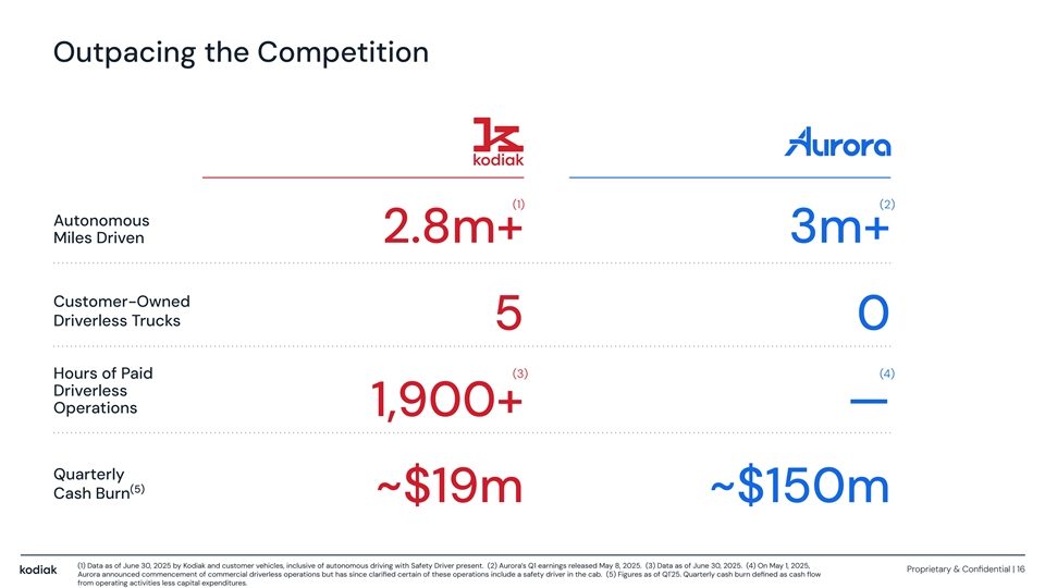 Real-World Impact and Demonstrated Market Leadership Autonomous (1) (2) Loads Delivered Miles Driven 7,300+ 2.8m+ Hours of Paid (3) (4) Network Size Driverless Operations ~23k miles 1,900+ (1) Data as of June 30, 2025, by Kodiak vehicles, inclusive of autonomous driving with Safety Driver present. (2) Data as of June 30, 2025, by Kodiak and customer vehicles, inclusive of autonomous driving with Safety Driver Proprietary & Confidential | 15 present. (3) Network represents miles for Commercial Trucking and Public Sector routes operated by Kodiak as of July 25, 2025. (4) Data as of June 30, 2025.
