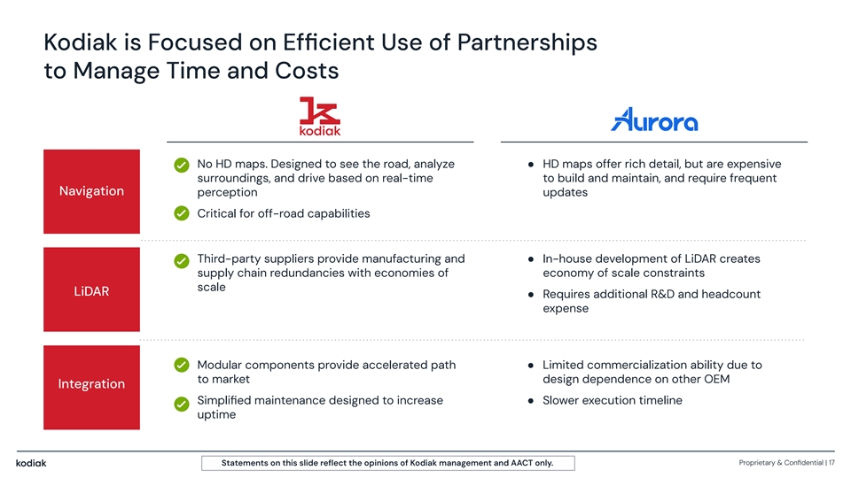 Outpacing the Competition (1) (2) Autonomous 2.8m+ 3m+ Miles Driven Customer-Owned Driverless Trucks 5 0 (3) (4) Hours of Paid Driverless Operations 1,900+ — Quarterly (5) Cash Burn ~$19m ~$150m (1) Data as of June 30, 2025 by Kodiak and customer vehicles, inclusive of autonomous driving with Safety Driver present. (2) Aurora’s Q1 earnings released May 8, 2025. (3) Data as of June 30, 2025. (4) On May 1, 2025, Proprietary & Confidential | 16 Aurora announced commencement of commercial driverless operations but has since clarified certain of these operations include a safety driver in the cab. (5) Figures as of Q1'25. Quarterly cash burn defined as cash flow from operating activities less capital expenditures.