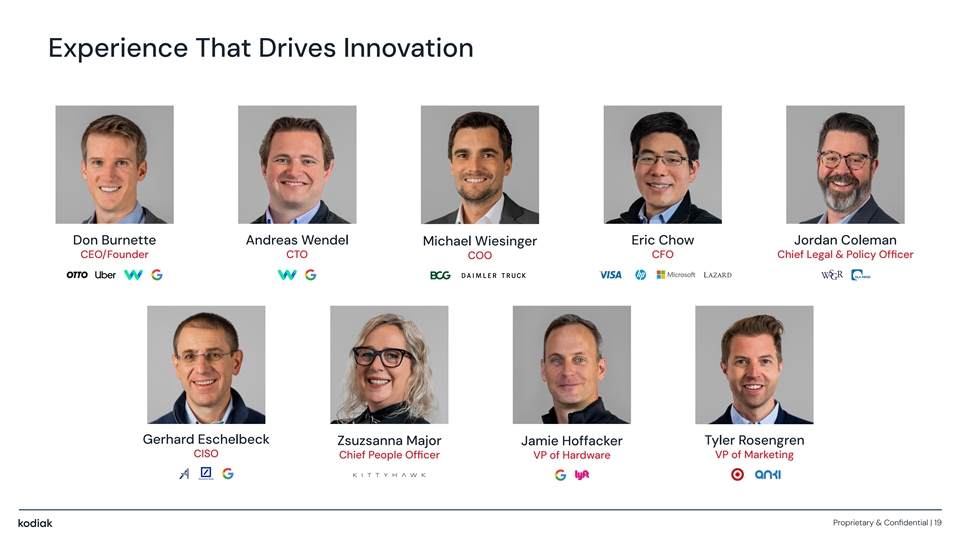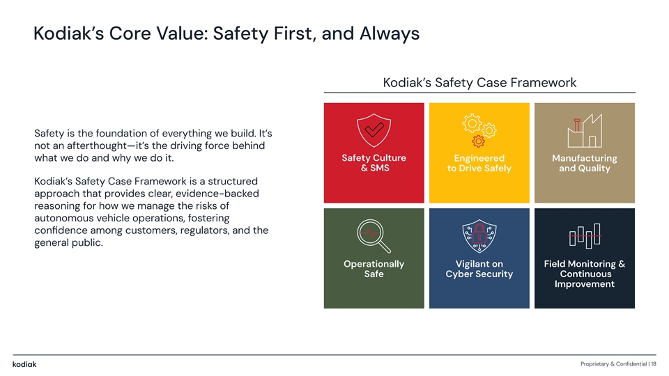 Kodiak’s Core Value: Safety First, and Always Kodiak’s Safety Case Framework Safety is the foundation of everything we build. It’s not an afterthought—it’s the driving force behind what we do and why we do it. Safety Culture Engineered Manufacturing & SMS to Drive Safely and Quality Kodiak’s Safety Case Framework is a structured approach that provides clear, evidence-backed reasoning for how we manage the risks of autonomous vehicle operations, fostering confidence among customers, regulators, and the general public. Operationally Vigilant on Field Monitoring & Safe Cyber Security Continuous Improvement Proprietary & Confidential | 18