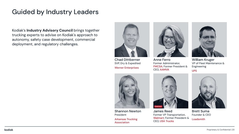 Guided by Industry Leaders Kodiak’s Industry Advisory Council brings together trucking experts to advise on Kodiak's approach to autonomy, safety case development, commercial deployment, and regulatory challenges. Chad Dittberner Anne Ferro William Kruger SVP, Dry & Expedited Former Administrator, VP of Fleet Maintenance & FMCSA; Former President & Engineering Werner Enterprises CEO, AAMVA UPS Shannon Newton James Reed Brett Suma President Former VP Transportation, Founder & CEO Walmart; Former President & Arkansas Trucking Loadsmith CEO, USA Trucks Association Proprietary & Confidential | 20