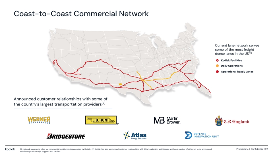 Coast-to-Coast Commercial Network Current lane network serves some of the most freight (1) dense lanes in the US Kodiak Facilities Daily Operations Operational Ready Lanes Announced customer relationships with some of (2) the country’s largest transportation providers (1) Network represents miles for commercial trucking routes operated by Kodiak. (2) Kodiak has also announced customer relationships with IKEA, Loadsmith, and Maersk, and has a number of other yet to be announced Proprietary & Confidential | 22 relationships with major shippers and carriers.