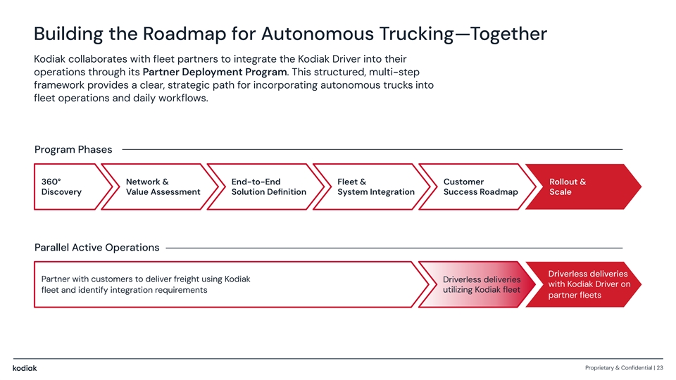 Building the Roadmap for Autonomous Trucking—Together Kodiak collaborates with fleet partners to integrate the Kodiak Driver into their operations through its Partner Deployment Program. This structured, multi-step framework provides a clear, strategic path for incorporating autonomous trucks into fleet operations and daily workflows. Program Phases 360° Network & End-to-End Fleet & Customer Rollout & Discovery Value Assessment Solution Definition System Integration Success Roadmap Scale Parallel Active Operations Driverless deliveries Partner with customers to deliver freight using Kodiak Driverless deliveries with Kodiak Driver on fleet and identify integration requirements utilizing Kodiak fleet partner fleets Proprietary & Confidential | 23