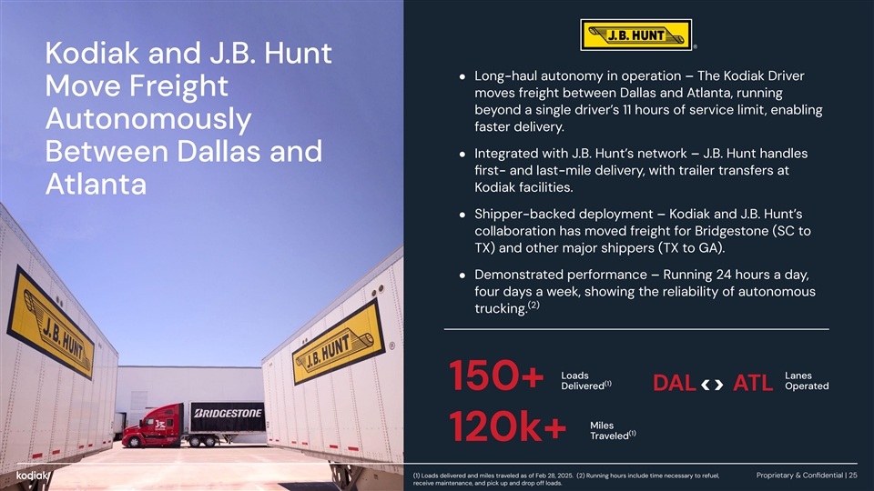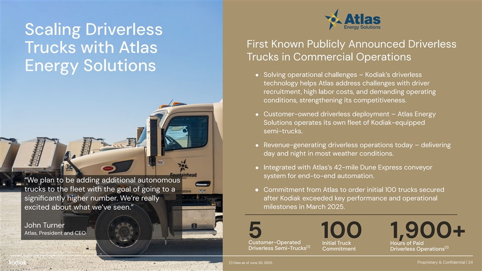 Scaling Driverless First Known Publicly Announced Driverless Trucks with Atlas Trucks in Commercial Operations Energy Solutions ● Solving operational challenges – Kodiak’s driverless technology helps Atlas address challenges with driver recruitment, high labor costs, and demanding operating conditions, strengthening its competitiveness. ● Customer-owned driverless deployment – Atlas Energy Solutions operates its own fleet of Kodiak-equipped semi-trucks. ● Revenue-generating driverless operations today – delivering day and night in most weather conditions. ● Integrated with Atlas’s 42-mile Dune Express conveyor system for end-to-end automation. “We plan to be adding additional autonomous trucks to the fleet with the goal of going to a ● Commitment from Atlas to order initial 100 trucks secured significantly higher number. We’re really after Kodiak exceeded key performance and operational milestones in March 2025. excited about what we’ve seen.” John Turner Atlas, President and CEO 5 100 1,900+ Customer-Operated Initial Truck Hours of Paid (1) (1) Driverless Semi-Trucks Commitment Driverless Operations Proprietary & Confidential | 24 (1) Data as of June 30, 2025.