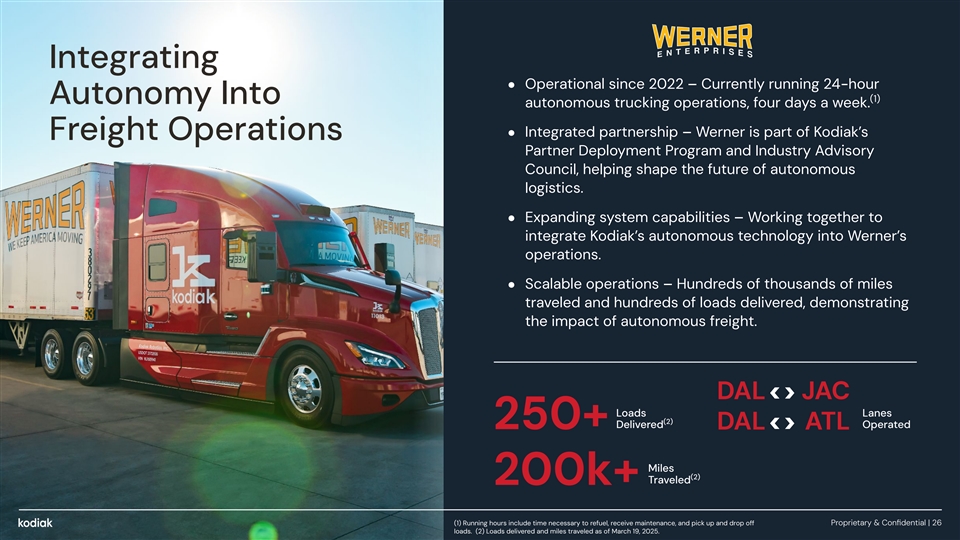 Kodiak and J.B. Hunt ● Long-haul autonomy in operation – The Kodiak Driver Move Freight moves freight between Dallas and Atlanta, running beyond a single driver’s 11 hours of service limit, enabling Autonomously faster delivery. ● Integrated with J.B. Hunt’s network – J.B. Hunt handles Between Dallas and first- and last-mile delivery, with trailer transfers at Kodiak facilities. Atlanta ● Shipper-backed deployment – Kodiak and J.B. Hunt’s collaboration has moved freight for Bridgestone (SC to TX) and other major shippers (TX to GA). ● Demonstrated performance – Running 24 hours a day, four days a week, showing the reliability of autonomous (2) trucking. Loads Lanes (1) Delivered Operated 150+ DAL ATL Miles (1) Traveled 120k+ (1) Loads delivered and miles traveled as of Feb 28, 2025. (2) Running hours include time necessary to refuel, Proprietary & Confidential | 25 receive maintenance, and pick up and drop off loads.