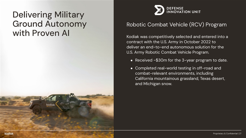 Delivering Military Robotic Combat Vehicle (RCV) Program Ground Autonomy with Proven AI Kodiak was competitively selected and entered into a contract with the U.S. Army in October 2022 to deliver an end-to-end autonomous solution for the U.S. Army Robotic Combat Vehicle Program. ● Received ~$30m for the 3-year program to date. ● Completed real-world testing in off-road and combat-relevant environments, including California mountainous grassland, Texas desert, and Michigan snow. Proprietary & Confidential | 27