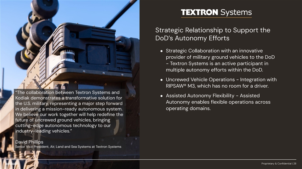 Strategic Relationship to Support the DoD’s Autonomy Efforts ● Strategic Collaboration with an innovative provider of military ground vehicles to the DoD - Textron Systems is an active participant in multiple autonomy efforts within the DoD. ● Uncrewed Vehicle Operations - Integration with RIPSAW® M3, which has no room for a driver. “The collaboration between Textron Systems and ● Assisted Autonomy Flexibility - Assisted Kodiak demonstrates a transformative solution for Autonomy enables flexible operations across the U.S. military, representing a major step forward operating domains. in delivering a mission-ready autonomous system. We believe our work together will help redefine the future of uncrewed ground vehicles, bringing cutting-edge autonomous technology to our industry-leading vehicles.” David Phillips Senior Vice President, Air, Land and Sea Systems at Textron Systems Proprietary & Confidential | 28