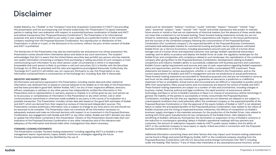 Disclaimer Kodiak Robotics, Inc. (“Kodiak” or the “Company”) and Ares Acquisition Corporation II (“AACT”) are providing words such as “anticipate,” “believe,” “continue,” “could,” “estimate,” “expect,” “forecast,” “intend,” “may,” this presentation and the accompanying oral remarks (collectively, the “Presentation”) to assist interested “plan,” “potential,” “project,” “seek,” “should,” “will,” “would” and similar expressions that predict or indicate parties in making their own evaluation with respect to a potential business combination of Kodiak and AACT future events or trends or that are not statements of historical matters, but the absence of these words does and related transactions (the “Proposed Business Combination”). The Presentation is for informational not mean that a statement is not forward-looking. These forward-looking statements include, but are not purposes only and is being provided to you solely in your capacity as a potential investor in the combined limited to, statements regarding: Kodiak’s and AACT’s expectations with respect to the future performance company resulting from the Proposed Business Combination. Any reproduction or distribution of this and the success of the combined company following the consummation of the Proposed Business Presentation, in whole or in part, or the disclosure of its contents, without the prior written consent of Kodiak Combination (the combined company ); the expected benefits of the Proposed Business Combination; and AACT is prohibited. estimated total addressable markets for commercial trucking and public sector applications; estimated Kodiak Driver-as-a-Service Economics, including assumptions around costs per mile of a human driver, The distribution of this Presentation may also be restricted by law and persons into whose possession this average cost of a human driver and expected customer cost savings; Kodiak’s operational and product Presentation comes should inform themselves about and observe any such restrictions. The recipient roadmap, and its ability to produce and deploy the Kodiak Driver at scale; the regulatory landscape for the acknowledges that (a) it is aware that the United States securities laws prohibit any person who has material, Kodiak Driver and complexities with compliance related to such landscape; the capitalization of the combined non-public information concerning a company from purchasing or selling securities of such company or from company after giving effect to the Proposed Business Combination; developments relating to Kodiak’s communicating such information to any other person under circumstances in which it is reasonably competitors and industry; Kodiak’s ability to successfully collaborate with business partners and customers; foreseeable that such person is likely to purchase or sell such securities, (b) it is familiar with the Securities Kodiak’s future capital requirements and sources and uses of cash; expectations regarding Kodiak’s expansion Exchange Act of 1934, as amended, and the rules and regulations promulgated thereunder (collectively, the plans and opportunities; and the completion of the $100.0 million contemplated PIPE investment. These “Exchange Act”), and (c) it will neither use, nor cause any third party to use, this Presentation or any statements are based on various assumptions, whether or not identified in this Presentation, and on the information contained herein in contravention of the Exchange Act, including, Rule 10b-5 thereunder. current expectations of Kodiak’s and AACT’s management and are not predictions of actual performance. These forward-looking statements are provided for illustrative purposes only and are not intended to serve as, INDUSTRY AND MARKET DATA and must not be relied upon by any investors as, a guarantee, an assurance, a prediction or a definitive All information and opinions expressed in this Presentation, including market data and other statistical statement of fact or probability. Actual events and circumstances are difficult or impossible to predict and will information, was obtained from or based on sources believed to be reliable as of the date of this Presentation differ from assumptions. Many actual events and circumstances are beyond the control of Kodiak and AACT. and has been provided in good faith. Neither Kodiak, AACT, nor any of their respective affiliates, directors, These forward-looking statements are subject to a number of risks and uncertainties, including changes in officers, employees or advisers or any other person has independently verified the information in this business, market, financial, political and legal conditions; the rapid evolution of autonomous vehicle Presentation and no representation or warranty, express or implied, is or will be given by any such person as technology and flaws or errors in Kodiak's solutions or flaws in or misuse of autonomous vehicle technology in to its accuracy or completeness of information in this Presentation or any other written, oral or other general; the inability of the parties to successfully or timely consummate the Proposed Business communications transmitted or otherwise made available to any party in the course of its evaluation of a Combination, including the risk that any regulatory approvals are not obtained, are delayed or are subject to possible transaction. This Presentation includes certain data also based on the good faith estimates of Kodiak unanticipated conditions that could adversely affect the combined company or the expected benefits of the and AACT, which are derived from their respective reviews of internal and independent sources. This Proposed Business Combination or that the approval of the equity holders of Kodiak or AACT is not obtained; Presentation contains preliminary information only, is subject to change at any time and is not and should not failure to rea