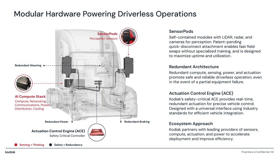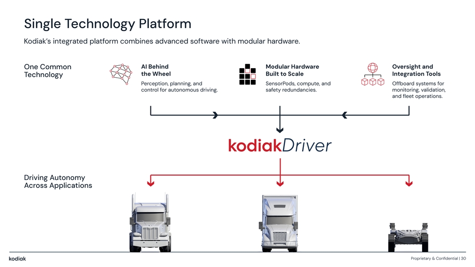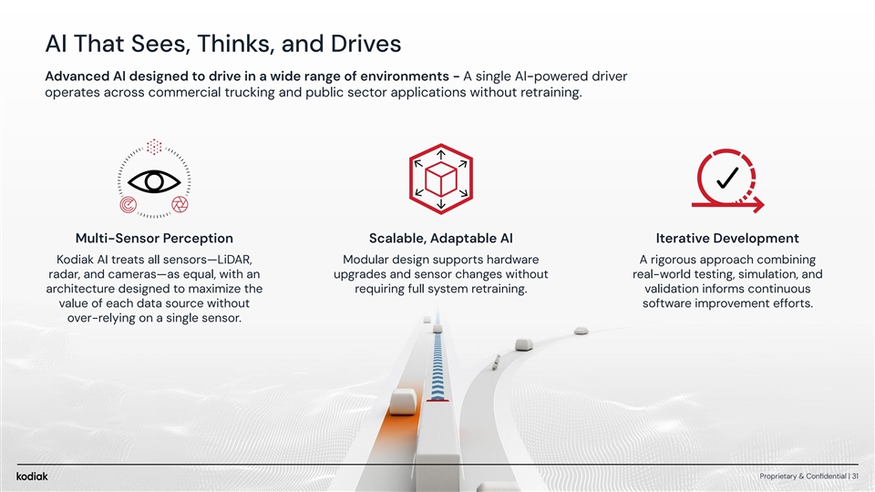 Single Technology Platform Kodiak’s integrated platform combines advanced software with modular hardware. AI Behind Modular Hardware Oversight and One Common the Wheel Built to Scale Integration Tools Technology Perception, planning, and SensorPods, compute, and Offboard systems for control for autonomous driving. safety redundancies. monitoring, validation, and fleet operations. Driving Autonomy Across Applications Proprietary & Confidential | 30