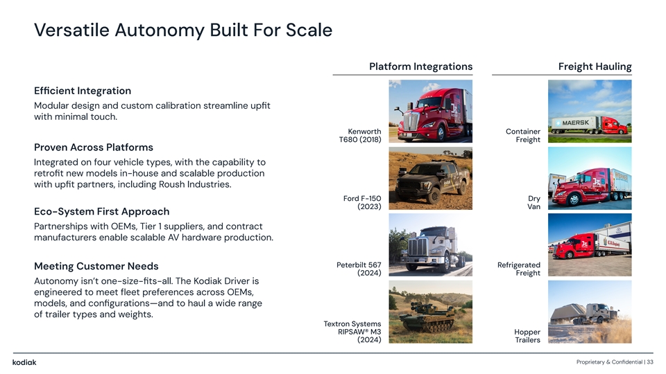 Modular Hardware Powering Driverless Operations SensorPods SensorPods Self-contained modules with LiDAR, radar, and Perception Sensors cameras for perception. Patent-pending quick-disconnect attachment enables fast field swaps without specialized training, and is designed to maximize uptime and utilization. Redundant Steering Redundant Architecture Redundant compute, sensing, power, and actuation promote safe and reliable driverless operation, even in the event of a partial equipment failure. Actuation Control Engine (ACE) AI Compute Stack Kodiak’s safety-critical ACE provides real-time, Compute, Networking, redundant actuation for precise vehicle control. Communications, Power Distribution, Cooling Designed with a universal interface using industry standards for efficient vehicle integration. Redundant Braking Redundant Power Ecosystem Approach Kodiak partners with leading providers of sensors, Actuation Control Engine (ACE) compute, actuation, and power to accelerate Safety Critical Controller deployment and improve efficiency. Sensing + Thinking Safety + Redundancy Proprietary & Confidential | 32