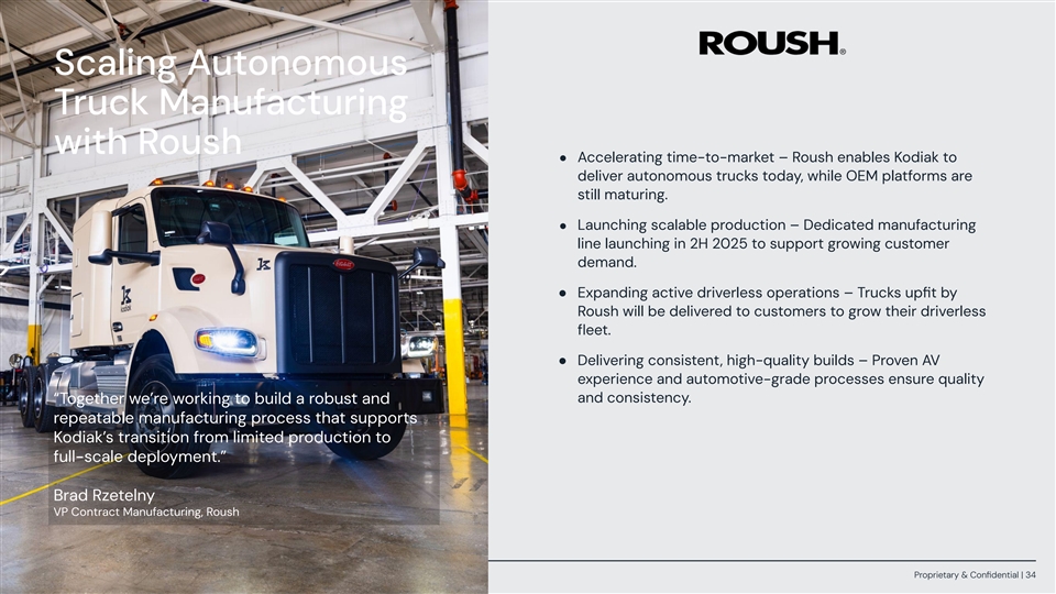 Versatile Autonomy Built For Scale Platform Integrations Freight Hauling Efficient Integration Modular design and custom calibration streamline upfit with minimal touch. Kenworth Container T680 (2018) Freight Proven Across Platforms Integrated on four vehicle types, with the capability to retrofit new models in-house and scalable production with upfit partners, including Roush Industries. Ford F-150 Dry (2023) Van Eco-System First Approach Partnerships with OEMs, Tier 1 suppliers, and contract manufacturers enable scalable AV hardware production. Peterbilt 567 Refrigerated Meeting Customer Needs (2024) Freight Autonomy isn’t one-size-fits-all. The Kodiak Driver is engineered to meet fleet preferences across OEMs, models, and configurations—and to haul a wide range of trailer types and weights. Textron Systems RIPSAW® M3 Hopper (2024) Trailers Proprietary & Confidential | 33