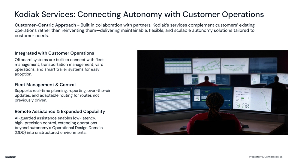 Kodiak Services: Connecting Autonomy with Customer Operations Customer-Centric Approach - Built in collaboration with partners, Kodiak’s services complement customers’ existing operations rather than reinventing them—delivering maintainable, flexible, and scalable autonomy solutions tailored to customer needs. Integrated with Customer Operations Offboard systems are built to connect with fleet management, transportation management, yard operations, and smart trailer systems for easy adoption. Fleet Management & Control Supports real-time planning, reporting, over-the-air updates, and adaptable routing for routes not previously driven. Remote Assistance & Expanded Capability AI-guarded assistance enables low-latency, high-precision control, extending operations beyond autonomy’s Operational Design Domain (ODD) into unstructured environments. Proprietary & Confidential | 35
