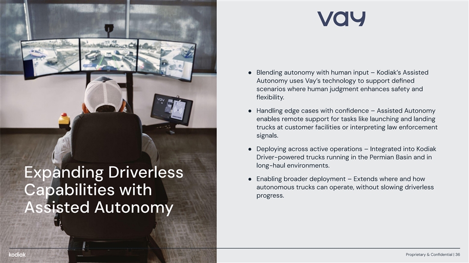 ● Blending autonomy with human input – Kodiak’s Assisted Autonomy uses Vay’s technology to support defined scenarios where human judgment enhances safety and flexibility. ● Handling edge cases with confidence – Assisted Autonomy enables remote support for tasks like launching and landing trucks at customer facilities or interpreting law enforcement signals. ● Deploying across active operations – Integrated into Kodiak Driver-powered trucks running in the Permian Basin and in long-haul environments. Expanding Driverless ● Enabling broader deployment – Extends where and how autonomous trucks can operate, without slowing driverless Capabilities with progress. Assisted Autonomy Proprietary & Confidential | 36