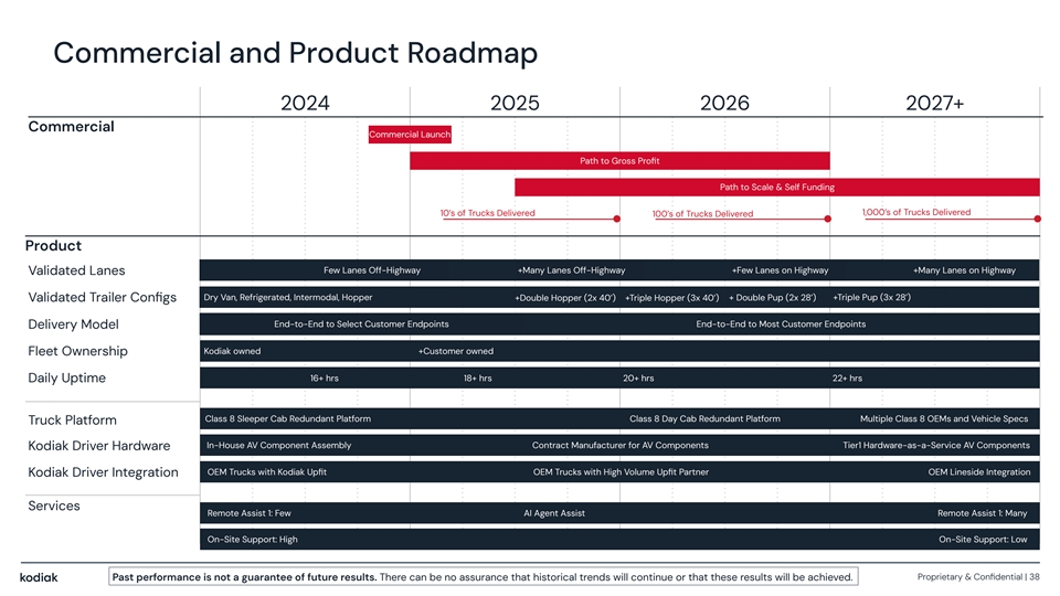 Commercial and Product Roadmap 2024 2025 2026 2027+ Commercial Commercial Launch Path to Gross Profit Path to Scale & Self Funding 1,000’s of Trucks Delivered 10’s of Trucks Delivered 100’s of Trucks Delivered Product Few Lanes Off-Highway +Many Lanes Off-Highway +Few Lanes on Highway +Many Lanes on Highway Validated Lanes Dry Van, Refrigerated, Intermodal, Hopper + Double Pup (2x 28’) +Triple Pup (3x 28’) Validated Trailer Configs +Double Hopper (2x 40’) +Triple Hopper (3x 40’) End-to-End to Select Customer Endpoints End-to-End to Most Customer Endpoints Delivery Model Kodiak owned +Customer owned Fleet Ownership 16+ hrs 18+ hrs 20+ hrs 22+ hrs Daily Uptime Class 8 Sleeper Cab Redundant Platform Class 8 Day Cab Redundant Platform Multiple Class 8 OEMs and Vehicle Specs Truck Platform In-House AV Component Assembly Contract Manufacturer for AV Components Tier1 Hardware-as-a-Service AV Components Kodiak Driver Hardware OEM Trucks with Kodiak Upfit OEM Trucks with High Volume Upfit Partner OEM Lineside Integration Kodiak Driver Integration Services Remote Assist 1: Few AI Agent Assist Remote Assist 1: Many On-Site Support: High On-Site Support: Low Proprietary & Confidential | 38 Past performance is not a guarantee of future results. There can be no assurance that historical trends will continue or that these results will be achieved.