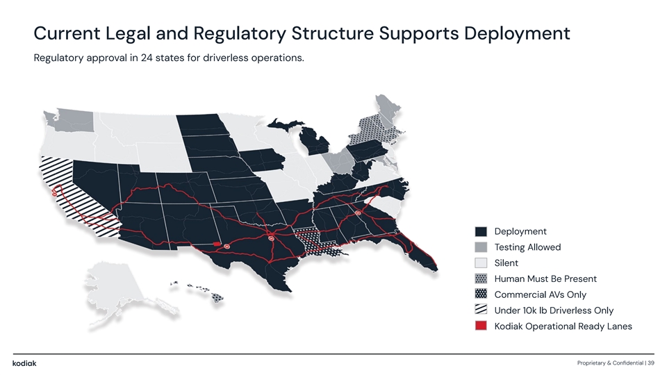 Current Legal and Regulatory Structure Supports Deployment Regulatory approval in 24 states for driverless operations. Deployment Testing Allowed Silent Human Must Be Present Commercial AVs Only Under 10k lb Driverless Only Kodiak Operational Ready Lanes Proprietary & Confidential | 39