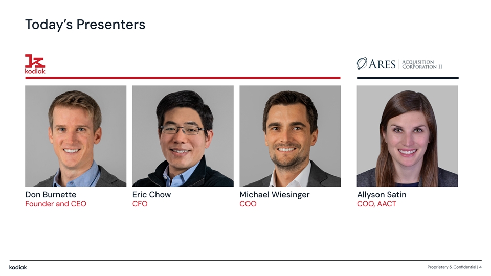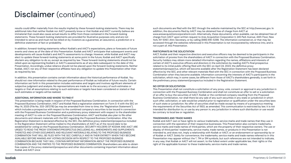 Disclaimer (continued) results could differ materially from the results implied by these forward-looking statements. There may be such documents are filed with the SEC through the website maintained by the SEC at http://www.sec.gov. In additional risks that neither Kodiak nor AACT presently know or that Kodiak and AACT currently believe are addition, the documents filed by AACT may be obtained free of charge from AACT at immaterial that could also cause actual results to differ from those contained in the forward-looking www.aresacquisitioncorporationii.com. Alternatively, these documents, when available, can be obtained free of statements. These forward-looking statements are provided for illustrative purposes only and are not charge from AACT upon written request to Ares Acquisition Corporation II, 245 Park Avenue, 44th Floor, New intended to serve as and must not be relied on by investors as a guarantee, an assurance, a prediction or a York, NY 10167, Attn: Secretary, or by calling (888) 818-5298. The information contained on, or that may be definitive statement of fact or probability. accessed through the websites referenced in this Presentation is not incorporated by reference into, and is not a part of, this Presentation. In addition, forward-looking statements reflect Kodiak’s and AACT’s expectations, plans or forecasts of future events and views as of the date of this Presentation. Kodiak and AACT anticipate that subsequent events and PARTICIPANTS IN THE SOLICITATION developments will cause Kodiak’s and AACT’s assessments to change. However, while Kodiak and AACT may AACT, Kodiak and their respective directors and executive officers may be deemed to be participants in the elect to update these forward-looking statements at some point in the future, Kodiak and AACT specifically solicitation of proxies from the shareholders of AACT in connection with the Proposed Business Combination. disclaim any obligation to do so, except as required by law. These forward-looking statements should not be Security holders may obtain more detailed information regarding the names, affiliations and interests of relied upon as representing Kodiak’s or AACT’s assessments as of any date subsequent to the date of this certain of AACT’s executive officers and directors in the solicitation by reading AACT’s final prospectus Presentation. Accordingly, undue reliance should not be placed upon the forward-looking statements. Neither related to its initial public offering filed with the SEC on April 24, 2023, the definitive proxy Kodiak, AACT, nor any of their respective affiliates have any obligation to update this Presentation other than statement/prospectus, which will become available after the Registration Statement has been declared as required by law. effective by the SEC, and other relevant materials filed with the SEC in connection with the Proposed Business Combination when they become available. Information concerning the interests of AACT’s participants in the In addition, this presentation contains certain information about the historical performance of Kodiak. You solicitation, which may, in some cases, be different from those of AACT’s shareholders generally, is set forth in should not view information related to the past performance of Kodiak as indicative of future results. Certain the preliminary proxy statement/prospectus included in the Registration Statement. information set forth in this presentation includes estimates and targets and involves significant elements of subjective judgment and analysis. No representations are made as to the accuracy of such estimates or NO OFFER OR SOLICITATION targets or that all assumptions relating to such estimates or targets have been considered or stated or that This Presentation shall not constitute a solicitation of any proxy, vote, consent or approval in any jurisdiction in such estimates or targets will be realized. connection with the Proposed Business Combination and shall not constitute an offer to sell or a solicitation of an offer to buy the securities of AACT, Kodiak or the combined company resulting from the Proposed ADDITIONAL INFORMATION AND WHERE TO FIND IT Business Combination, nor shall there be any sale of any such securities in any state or jurisdiction in which This presentation is being made in respect of the Proposed Business Combination. In connection with the such offer, solicitation, or sale would be unlawful prior to registration or qualification under the securities laws Proposed Business Combination, AACT and Kodiak filed a registration statement on Form S-4 with the SEC on of such state or jurisdiction. No offer of securities shall be made except by means of a prospectus meeting May 14, 2025 (File No. 333-287278) (as may be amended from time to time, the “Registration Statement”), the requirements of the Securities Act of 1933, as amended. This communication is restricted by law; it is not which includes a prospectus with respect to the combined company’s securities to be issued in connection intended for distribution to, or use by any person in, any jurisdiction in where such distribution or use would with the Proposed Business Combination and a preliminary proxy statement with respect to the shareholder be contrary to local law or regulation. meeting of AACT to vote on the Proposed Business Combination. AACT and Kodiak also plan to file other documents and relevant materials with the SEC regarding the Proposed Business Combination. After the TRADEMARKS AND TRADE NAMES Registration Statement is declared effective by the SEC, the definitive proxy statement/prospectus included Kodiak and AACT own or have rights to various trademarks, service marks and trade names that they use in in the Registration Statement will be mailed to the shareholders of AACT as of the record date to be connection with the operation of their respective businesses. This Presentation also contains trademarks, established for 