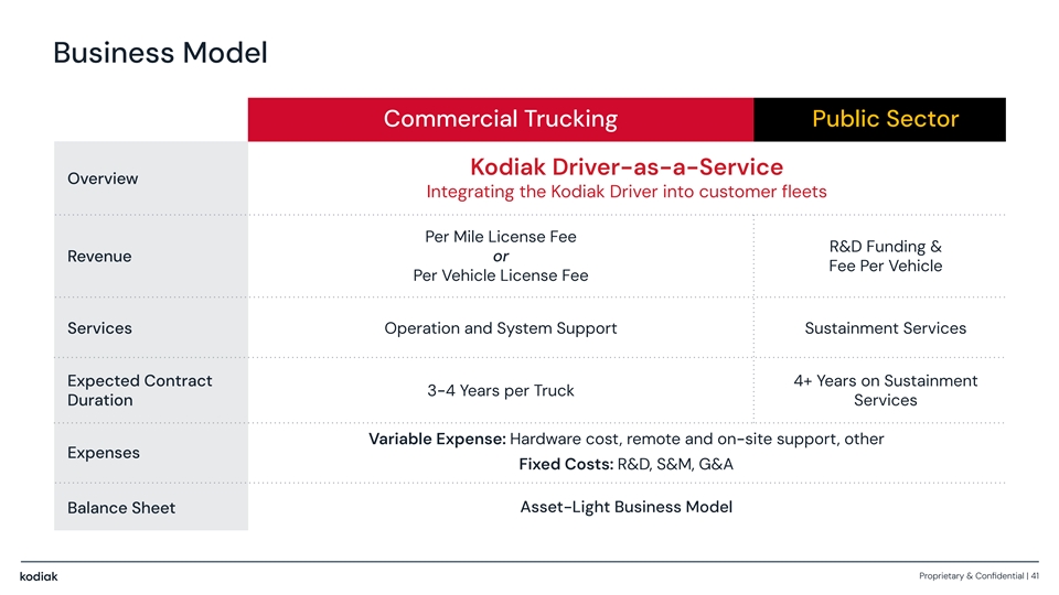 Business Model Commercial Trucking Public Sector Kodiak Driver-as-a-Service Overview Integrating the Kodiak Driver into customer fleets Per Mile License Fee R&D Funding & Revenue or Fee Per Vehicle Per Vehicle License Fee Services Operation and System Support Sustainment Services Expected Contract 4+ Years on Sustainment 3-4 Years per Truck Duration Services Variable Expense: Hardware cost, remote and on-site support, other Expenses Fixed Costs: R&D, S&M, G&A Asset-Light Business Model Balance Sheet Proprietary & Confidential | 41