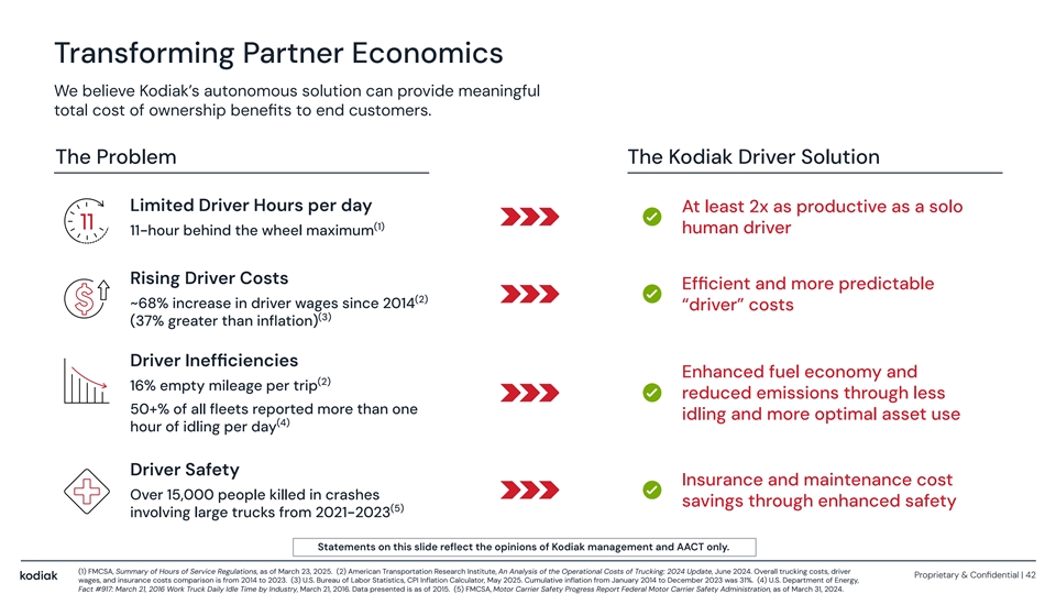 Transforming Partner Economics We believe Kodiak’s autonomous solution can provide meaningful total cost of ownership benefits to end customers. The Problem The Kodiak Driver Solution Limited Driver Hours per day At least 2x as productive as a solo (1) human driver 11-hour behind the wheel maximum Rising Driver Costs Efficient and more predictable (2) ~68% increase in driver wages since 2014 “driver” costs (3) (37% greater than inflation) Driver Inefficiencies Enhanced fuel economy and (2) 16% empty mileage per trip reduced emissions through less 50+% of all fleets reported more than one idling and more optimal asset use (4) hour of idling per day Driver Safety Insurance and maintenance cost Over 15,000 people killed in crashes savings through enhanced safety (5) involving large trucks from 2021-2023 Statements on this slide reflect the opinions of Kodiak management and AACT only. (1) FMCSA, Summary of Hours of Service Regulations, as of March 23, 2025. (2) American Transportation Research Institute, An Analysis of the Operational Costs of Trucking: 2024 Update, June 2024. Overall trucking costs, driver Proprietary & Confidential | 42 wages, and insurance costs comparison is from 2014 to 2023. (3) U.S. Bureau of Labor Statistics, CPI Inflation Calculator, May 2025. Cumulative inflation from January 2014 to December 2023 was 31%. (4) U.S. Department of Energy, Fact #917: March 21, 2016 Work Truck Daily Idle Time by Industry, March 21, 2016. Data presented is as of 2015. (5) FMCSA, Motor Carrier Safety Progress Report Federal Motor Carrier Safety Administration, as of March 31, 2024.