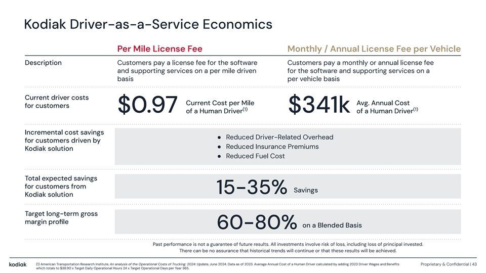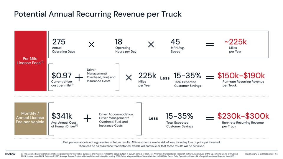 Kodiak Driver-as-a-Service Economics Per Mile License Fee Monthly / Annual License Fee per Vehicle Description Customers pay a license fee for the software Customers pay a monthly or annual license fee and supporting services on a per mile driven for the software and supporting services on a basis per vehicle basis Current driver costs Current Cost per Mile Avg. Annual Cost for customers (1) (1) $0.97 $341k of a Human Driver of a Human Driver Incremental cost savings ● Reduced Driver-Related Overhead for customers driven by ● Reduced Insurance Premiums Kodiak solution ● Reduced Fuel Cost Total expected savings for customers from Savings 15-35% Kodiak solution Target long-term gross margin profile on a Blended Basis 60-80% Past performance is not a guarantee of future results. All investments involve risk of loss, including loss of principal invested. There can be no assurance that historical trends will continue or that these results will be achieved. (1) American Transportation Research Institute, An analysis of the Operational Costs of Trucking: 2024: Update, June 2024. Data as of 2023. Average Annual Cost of a Human Driver calculated by adding 2023 Driver Wages and Benefits Proprietary & Confidential | 43 which totals to $38.90 x Target Daily Operational Hours 24 x Target Operational Days per Year 365.