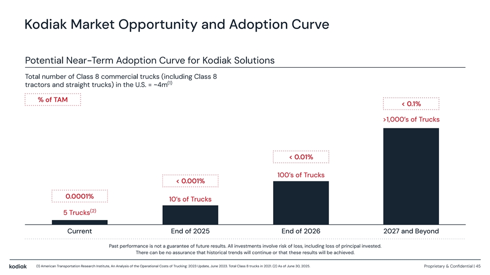 Potential Annual Recurring Revenue per Truck 275 18 45 ~225k Annual Operating MPH Avg. Miles Operating Days Hours per Day Speed per Year Per Mile (1) License Fees Driver Management/ $0.97 225k 15-35% $150k-$190k Overhead, Fuel, and Less Insurance Costs Current driver Miles Run-rate Recurring Revenue Total Expected (2) cost per mile per Year per Truck Customer Savings Monthly / Driver Accommodation, $341k 15-35% $230k-$300k Annual License Driver Management/ Less Overhead, Fuel, and Fee per Vehicle Avg. Annual Cost Total Expected Run-rate Recurring Revenue (2) Insurance Costs of Human Driver Customer Savings per Truck Past performance is not a guarantee of future results. All investments involve risk of loss, including loss of principal invested. There can be no assurance that historical trends will continue or that these results will be achieved. (1) The assumed operational information is presented for illustrative purposes and may not reflect the actual output in a given period, or at all. (2) American Transportation Research Institute, An analysis of the Operational Costs of Trucking: Proprietary & Confidential | 44 2024: Update, June 2024. Data as of 2023. Average Annual Cost of a Human Driver calculated by adding 2023 Driver Wages and Benefits which totals to $38.90 x Target Daily Operational Hours 24 x Target Operational Days per Year 365.