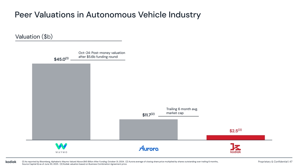 Peer Valuations in Autonomous Vehicle Industry Valuation ($b) Oct-24: Post-money valuation after $5.6b funding round (1) $45.0 Trailing 6 month avg. market cap (2) $11.7 (3) $2.5 (1) As reported by Bloomberg, Alphabet’s Waymo Valued Above $45 Billion After Funding, October 31, 2024. (2) Aurora average of closing share price multiplied by shares outstanding over trailing 6 months,. Proprietary & Confidential | 47 Source Capital IQ as of June 30, 2025. (3) Kodiak valuation based on Business Combination Agreement price.