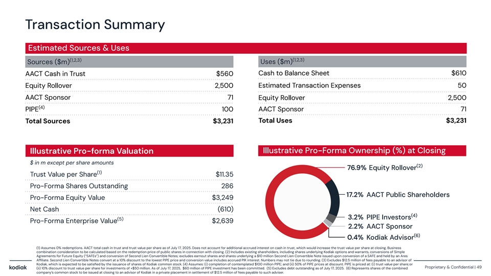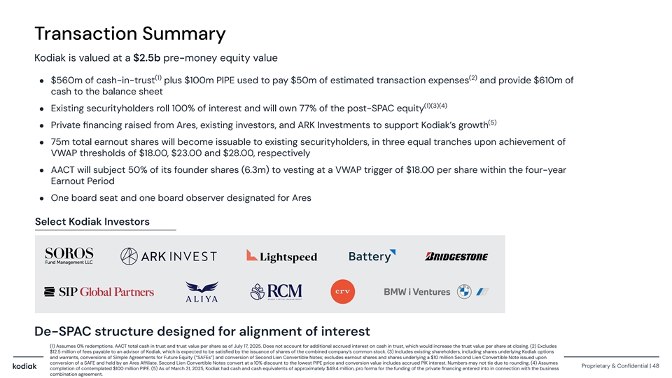 Transaction Summary Kodiak is valued at a $2.5b pre-money equity value (1) (2) ● $560m of cash-in-trust plus $100m PIPE used to pay $50m of estimated transaction expenses and provide $610m of cash to the balance sheet (1)(3)(4) ● Existing securityholders roll 100% of interest and will own 77% of the post-SPAC equity (5) ● Private financing raised from Ares, existing investors, and ARK Investments to support Kodiak’s growth ● 75m total earnout shares will become issuable to existing securityholders, in three equal tranches upon achievement of VWAP thresholds of $18.00, $23.00 and $28.00, respectively ● AACT will subject 50% of its founder shares (6.3m) to vesting at a VWAP trigger of $18.00 per share within the four-year Earnout Period ● One board seat and one board observer designated for Ares Select Kodiak Investors De-SPAC structure designed for alignment of interest (1) Assumes 0% redemptions. AACT total cash in trust and trust value per share as of July 17, 2025. Does not account for additional accrued interest on cash in trust, which would increase the trust value per share at closing. (2) Excludes $12.5 million of fees payable to an advisor of Kodiak, which is expected to be satisfied by the issuance of shares of the combined company’s common stock. (3) Includes existing shareholders, including shares underlying Kodiak options and warrants, conversions of Simple Agreements for Future Equity (“SAFEs”) and conversion of Second Lien Convertible Notes; excludes earnout shares and shares underlying a $10 million Second Lien Convertible Note issued upon conversion of a SAFE and held by an Ares Affiliate. Second Lien Convertible Notes convert at a 10% discount to the lowest PIPE price and conversion value includes accrued PIK interest. Numbers may not tie due to rounding. (4) Assumes Proprietary & Confidential | 48 completion of contemplated $100 million PIPE. (5) As of March 31, 2025, Kodiak had cash and cash equivalents of approximately $49.4 million, pro forma for the funding of the private financing entered into in connection with the business combination agreement.