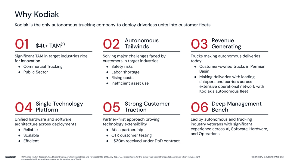 Why Kodiak Kodiak is the only autonomous trucking company to deploy driverless units into customer fleets. Autonomous Revenue (1) $4t+ TAM Tailwinds Generating 01 02 03 Significant TAM in target industries ripe Solving major challenges faced by Trucks making autonomous deliveries for innovation customers in target industries today ● Commercial Trucking● Safety risks● Customer-owned trucks in Permian Basin ● Public Sector● Labor shortage ● Making deliveries with leading ● Rising costs shippers and carriers across ● Inefficient asset use extensive operational network with Kodiak’s autonomous fleet Single Technology Strong Customer Deep Management Platform Traction Bench 04 05 06 Unified hardware and software Partner-first approach proving Led by autonomous and trucking architecture across deployments technology extensibility industry veterans with significant experience across AI, Software, Hardware, ● Reliable● Atlas partnership and Operations ● Scalable● OTR customer testing ● Efficient● ~$30m received under DoD contract (1) Verified Market Research, Road Freight Transportation Market Size and Forecast 2023-2031, July 2024. TAM presented is for the global road freight transportation market, which includes light Proprietary & Confidential | 51 commercial vehicles and heavy commercial vehicles, as of 2023.