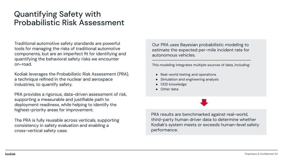 Quantifying Safety with Probabilistic Risk Assessment Traditional automotive safety standards are powerful Our PRA uses Bayesian probabilistic modeling to tools for managing the risks of traditional automotive estimate the expected per-mile incident rate for components, but are an imperfect fit for identifying and autonomous vehicles. quantifying the behavioral safety risks we encounter on-road. This modeling integrates multiple sources of data, including: Kodiak leverages the Probabilistic Risk Assessment (PRA), ● Real-world testing and operations ● Simulation and engineering analysis a technique refined in the nuclear and aerospace ● ODD knowledge industries, to quantify safety. ● Other data PRA provides a rigorous, data-driven assessment of risk, supporting a measurable and justifiable path to deployment readiness, while helping to identify the highest-priority areas for improvement. PRA results are benchmarked against real-world, third-party human driver data to determine whether The PRA is fully reusable across verticals, supporting Kodiak’s system meets or exceeds human-level safety consistency in safety evaluation and enabling a performance. cross-vertical safety case. Proprietary & Confidential | 54