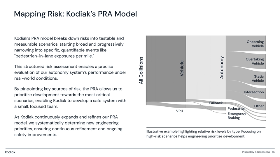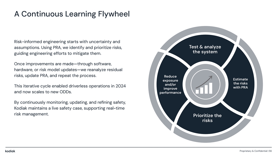Prioritize the risks A Continuous Learning Flywheel Risk-informed engineering starts with uncertainty and Test & analyze assumptions. Using PRA, we identify and prioritize risks, the system guiding engineering efforts to mitigate them. Once improvements are made—through software, hardware, or risk model updates—we reanalyze residual risks, update PRA, and repeat the process. This iterative cycle enabled driverless operations in 2024 and now scales to new ODDs. By continuously monitoring, updating, and refining safety, Kodiak maintains a live safety case, supporting real-time risk management. Proprietary & Confidential | 56 Reduce exposure and/or improve performance Estimate the risks with PRA