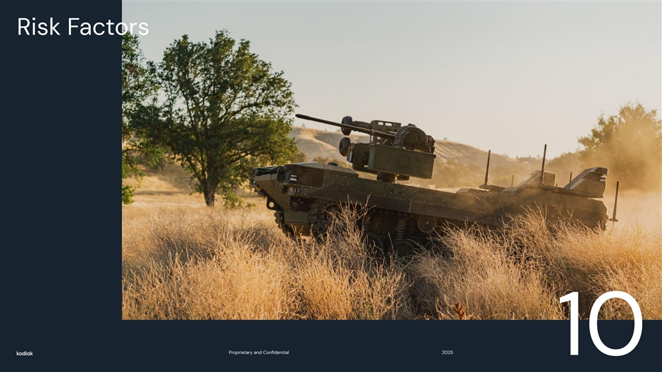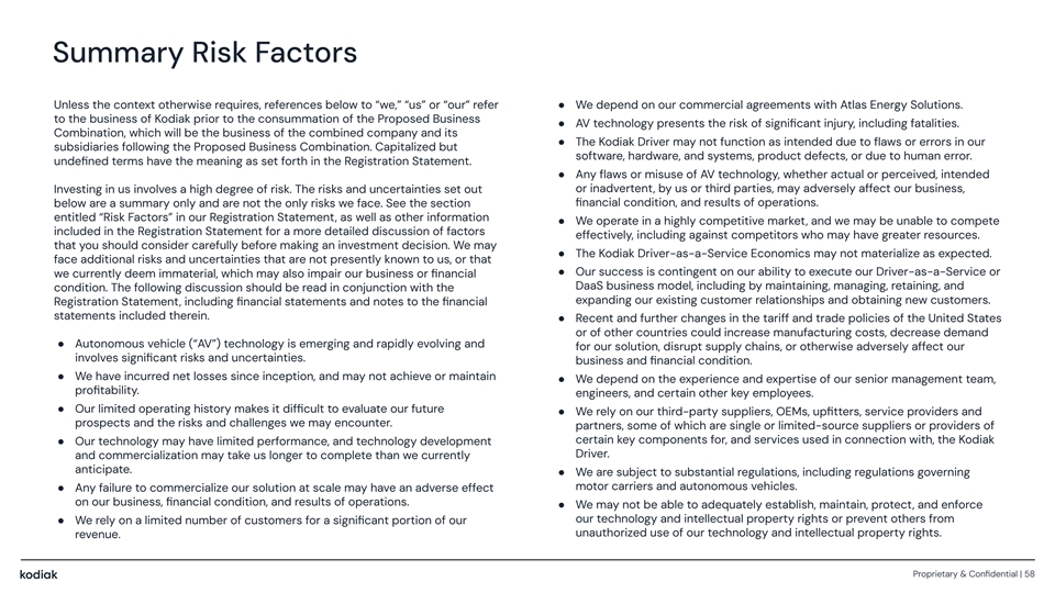 Summary Risk Factors Unless the context otherwise requires, references below to “we,” “us” or “our” refer ● We depend on our commercial agreements with Atlas Energy Solutions. to the business of Kodiak prior to the consummation of the Proposed Business ● AV technology presents the risk of significant injury, including fatalities. Combination, which will be the business of the combined company and its ● The Kodiak Driver may not function as intended due to flaws or errors in our subsidiaries following the Proposed Business Combination. Capitalized but software, hardware, and systems, product defects, or due to human error. undefined terms have the meaning as set forth in the Registration Statement. ● Any flaws or misuse of AV technology, whether actual or perceived, intended or inadvertent, by us or third parties, may adversely affect our business, Investing in us involves a high degree of risk. The risks and uncertainties set out financial condition, and results of operations. below are a summary only and are not the only risks we face. See the section entitled “Risk Factors” in our Registration Statement, as well as other information ● We operate in a highly competitive market, and we may be unable to compete included in the Registration Statement for a more detailed discussion of factors effectively, including against competitors who may have greater resources. that you should consider carefully before making an investment decision. We may ● The Kodiak Driver-as-a-Service Economics may not materialize as expected. face additional risks and uncertainties that are not presently known to us, or that ● Our success is contingent on our ability to execute our Driver-as-a-Service or we currently deem immaterial, which may also impair our business or financial DaaS business model, including by maintaining, managing, retaining, and condition. The following discussion should be read in conjunction with the expanding our existing customer relationships and obtaining new customers. Registration Statement, including financial statements and notes to the financial statements included therein. ● Recent and further changes in the tariff and trade policies of the United States or of other countries could increase manufacturing costs, decrease demand ● Autonomous vehicle (“AV”) technology is emerging and rapidly evolving and for our solution, disrupt supply chains, or otherwise adversely affect our involves significant risks and uncertainties. business and financial condition. ● We have incurred net losses since inception, and may not achieve or maintain ● We depend on the experience and expertise of our senior management team, profitability. engineers, and certain other key employees. ● Our limited operating history makes it difficult to evaluate our future ● We rely on our third-party suppliers, OEMs, upfitters, service providers and prospects and the risks and challenges we may encounter. partners, some of which are single or limited-source suppliers or providers of certain key components for, and services used in connection with, the Kodiak ● Our technology may have limited performance, and technology development Driver. and commercialization may take us longer to complete than we currently anticipate. ● We are subject to substantial regulations, including regulations governing motor carriers and autonomous vehicles. ● Any failure to commercialize our solution at scale may have an adverse effect on our business, financial condition, and results of operations. ● We may not be able to adequately establish, maintain, protect, and enforce our technology and intellectual property rights or prevent others from ● We rely on a limited number of customers for a significant portion of our unauthorized use of our technology and intellectual property rights. revenue. Proprietary & Confidential | 58