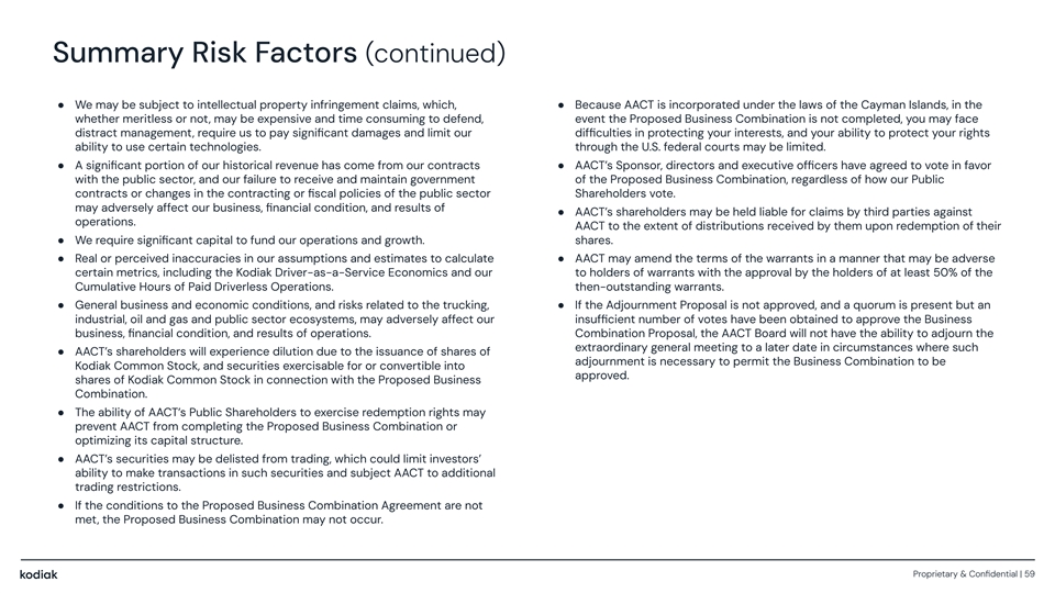 Summary Risk Factors (continued) ● We may be subject to intellectual property infringement claims, which, ● Because AACT is incorporated under the laws of the Cayman Islands, in the whether meritless or not, may be expensive and time consuming to defend, event the Proposed Business Combination is not completed, you may face distract management, require us to pay significant damages and limit our difficulties in protecting your interests, and your ability to protect your rights ability to use certain technologies. through the U.S. federal courts may be limited. ● A significant portion of our historical revenue has come from our contracts ● AACT’s Sponsor, directors and executive officers have agreed to vote in favor with the public sector, and our failure to receive and maintain government of the Proposed Business Combination, regardless of how our Public contracts or changes in the contracting or fiscal policies of the public sector Shareholders vote. may adversely affect our business, financial condition, and results of ● AACT’s shareholders may be held liable for claims by third parties against operations. AACT to the extent of distributions received by them upon redemption of their ● We require significant capital to fund our operations and growth. shares. ● Real or perceived inaccuracies in our assumptions and estimates to calculate ● AACT may amend the terms of the warrants in a manner that may be adverse certain metrics, including the Kodiak Driver-as-a-Service Economics and our to holders of warrants with the approval by the holders of at least 50% of the Cumulative Hours of Paid Driverless Operations. then-outstanding warrants. ● General business and economic conditions, and risks related to the trucking, ● If the Adjournment Proposal is not approved, and a quorum is present but an industrial, oil and gas and public sector ecosystems, may adversely affect our insufficient number of votes have been obtained to approve the Business business, financial condition, and results of operations. Combination Proposal, the AACT Board will not have the ability to adjourn the extraordinary general meeting to a later date in circumstances where such ● AACT’s shareholders will experience dilution due to the issuance of shares of adjournment is necessary to permit the Business Combination to be Kodiak Common Stock, and securities exercisable for or convertible into approved. shares of Kodiak Common Stock in connection with the Proposed Business Combination. ● The ability of AACT’s Public Shareholders to exercise redemption rights may prevent AACT from completing the Proposed Business Combination or optimizing its capital structure. ● AACT’s securities may be delisted from trading, which could limit investors’ ability to make transactions in such securities and subject AACT to additional trading restrictions. ● If the conditions to the Proposed Business Combination Agreement are not met, the Proposed Business Combination may not occur. Proprietary & Confidential | 59