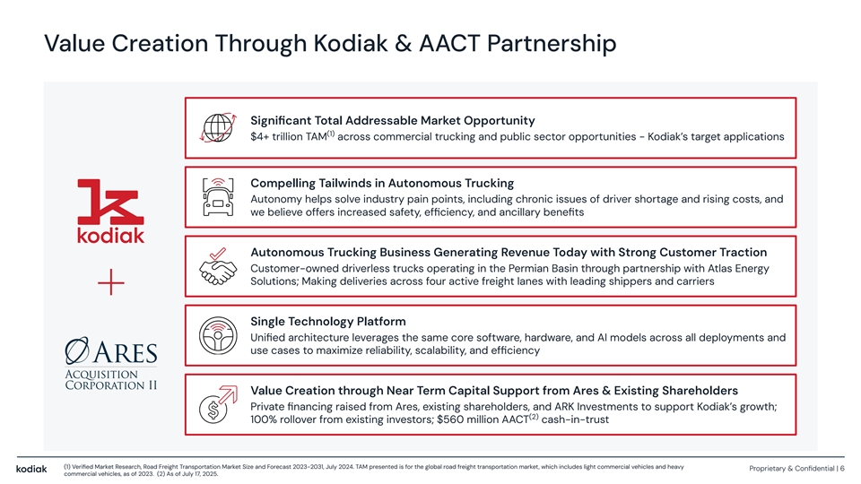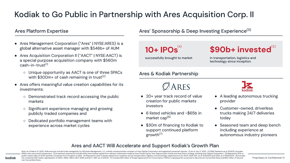 Kodiak to Go Public in Partnership with Ares Acquisition Corp. II (3) Ares Platform Expertise Ares’ Sponsorship & Deep Investing Experience ● Ares Management Corporation (“Ares” | NYSE:ARES) is a (4) (5) global alternative asset manager with $546b+ of AUM $90b+ invested 10+ IPOs ● Ares Acquisition Corporation II (“AACT” | NYSE:AACT) is successfully brought to market in transportation, logistics and a special purpose acquisition company with $560m technology since inception (1) cash-in-trust ○ Unique opportunity as AACT is one of three SPACs Ares & Kodiak Partnership (2) with $300m+ of cash remaining in trust ● Ares offers meaningful value creation capabilities for its investments: ○ Demonstrated track record accessing the public ● 20+ year track record of value ● A leading autonomous trucking markets creation for public markets provider investors ○ Significant experience managing and growing ● Customer-owned, driverless publicly traded companies and ● 6 listed vehicles and ~$65b in trucks making 24/7 deliveries (6) market cap today ○ Dedicated portfolio management teams with experience across market cycles● $30m of financing to Kodiak to ● Seasoned team and deep bench support continued platform including experience at (7) growth autonomous industry pioneers Ares and AACT Will Accelerate and Support Kodiak’s Growth Plan Note: As of March 31, 2025. AUM amounts include funds managed by Ivy Hill Asset Management, L.P., a wholly owned portfolio company of Ares Capital Corporation and registered investment adviser. (1) As of July 17, 2025. (2) SPAC Research as of 3/24/25, excludes SPACs with announced transactions. (3) Investment experience includes IPOs and invested capital from relevant investments made by Ares Private Equity, Ares Opportunistic Credit and Ares Direct Lending, including Ares Capital Corporation. (4) Represents IPOs or public market sales of ACOF portfolio companies from inception to date. (5) Represents total invested capital since inception across transportation, logistics, and technology related sectors by ACOF, ASOF, EDL as of 12/31/2024 and USDL as of 9/30/2024. (6) Includes the combined USD market capitalization of ARCC, ARDC, ARES, AACT, ACRE and GLP J-REIT as of 3/31/25. (7) Includes $10 million of Simple Agreements for Future Equity (“SAFEs”) subsequently converted to Second Lien Convertible Notes and $20 million of Second Proprietary & Confidential | 5 Lien Convertible Notes.