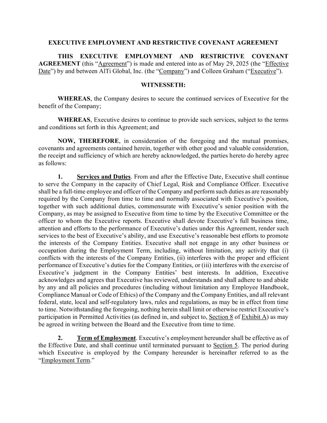 EXECUTIVE EMPLOYMENT AND RESTRICTIVE COVENANT AGREEMENT THIS EXECUTIVE EMPLOYMENT AND RESTRICTIVE COVENANT AGREEMENT (this “Agreement”) is made and entered into as of May 29, 2025 (the “Effective Date”) by and between AlTi Global, Inc. (the “Company”) and Colleen Graham (“Executive”). WITNESSETH: WHEREAS, the Company desires to secure the continued services of Executive for the benefit of the Company; WHEREAS, Executive desires to continue to provide such services, subject to the terms and conditions set forth in this Agreement; and NOW, THEREFORE, in consideration of the foregoing and the mutual promises, covenants and agreements contained herein, together with other good and valuable consideration, the receipt and sufficiency of which are hereby acknowledged, the parties hereto do hereby agree as follows: 1. Services and Duties. From and after the Effective Date, Executive shall continue to serve the Company in the capacity of Chief Legal, Risk and Compliance Officer. Executive shall be a full-time employee and officer of the Company and perform such duties as are reasonably required by the Company from time to time and normally associated with Executive’s position, together with such additional duties, commensurate with Executive’s senior position with the Company, as may be assigned to Executive from time to time by the Executive Committee or the officer to whom the Executive reports. Executive shall devote Executive’s full business time, attention and efforts to the performance of Executive’s duties under this Agreement, render such services to the best of Executive’s ability, and use Executive’s reasonable best efforts to promote the interests of the Company Entities. Executive shall not engage in any other business or occupation during the Employment Term, including, without limitation, any activity that (i) conflicts with the interests of the Company Entities, (ii) interferes with the proper and efficient performance of Executive’s duties for the Company Entities, or (iii) interferes with the exercise of Executive’s judgment in the Company Entities’ best interests. In addition, Executive acknowledges and agrees that Executive has reviewed, understands and shall adhere to and abide by any and all policies and procedures (including without limitation any Employee Handbook, Compliance Manual or Code of Ethics) of the Company and the Company Entities, and all relevant federal, state, local and self-regulatory laws, rules and regulations, as may be in effect from time to time. Notwithstanding the foregoing, nothing herein shall limit or otherwise restrict Executive’s participation in Permitted Activities (as defined in, and subject to, Section 8 of Exhibit A) as may be agreed in writing between the Board and the Executive from time to time. 2. Term of Employment. Executive’s employment hereunder shall be effective as of the Effective Date, and shall continue until terminated pursuant to Section 5. The period during which Executive is employed by the Company hereunder is hereinafter referred to as the “Employment Term.”