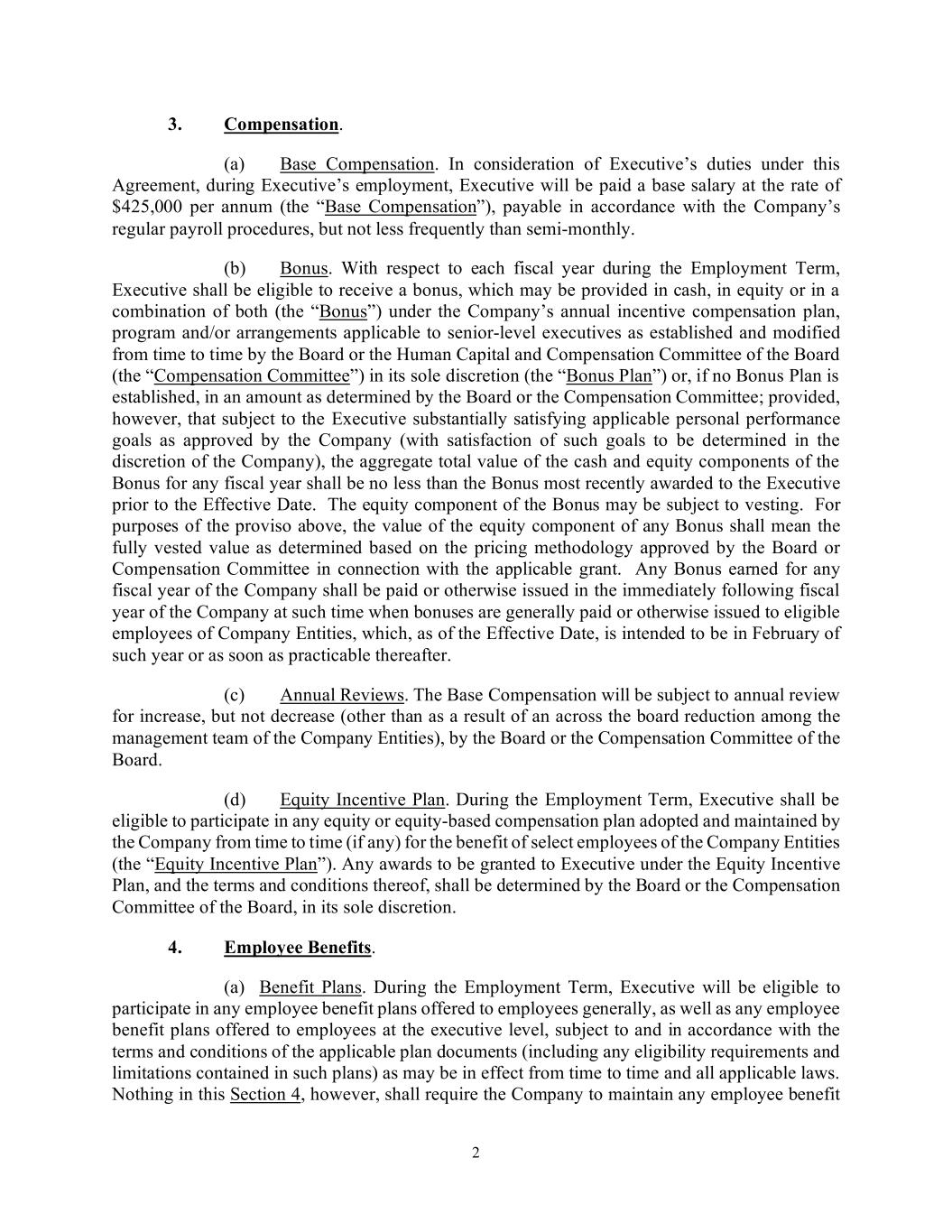 2 3. Compensation. (a) Base Compensation. In consideration of Executive’s duties under this Agreement, during Executive’s employment, Executive will be paid a base salary at the rate of $425,000 per annum (the “Base Compensation”), payable in accordance with the Company’s regular payroll procedures, but not less frequently than semi-monthly. (b) Bonus. With respect to each fiscal year during the Employment Term, Executive shall be eligible to receive a bonus, which may be provided in cash, in equity or in a combination of both (the “Bonus”) under the Company’s annual incentive compensation plan, program and/or arrangements applicable to senior-level executives as established and modified from time to time by the Board or the Human Capital and Compensation Committee of the Board (the “Compensation Committee”) in its sole discretion (the “Bonus Plan”) or, if no Bonus Plan is established, in an amount as determined by the Board or the Compensation Committee; provided, however, that subject to the Executive substantially satisfying applicable personal performance goals as approved by the Company (with satisfaction of such goals to be determined in the discretion of the Company), the aggregate total value of the cash and equity components of the Bonus for any fiscal year shall be no less than the Bonus most recently awarded to the Executive prior to the Effective Date. The equity component of the Bonus may be subject to vesting. For purposes of the proviso above, the value of the equity component of any Bonus shall mean the fully vested value as determined based on the pricing methodology approved by the Board or Compensation Committee in connection with the applicable grant. Any Bonus earned for any fiscal year of the Company shall be paid or otherwise issued in the immediately following fiscal year of the Company at such time when bonuses are generally paid or otherwise issued to eligible employees of Company Entities, which, as of the Effective Date, is intended to be in February of such year or as soon as practicable thereafter. (c) Annual Reviews. The Base Compensation will be subject to annual review for increase, but not decrease (other than as a result of an across the board reduction among the management team of the Company Entities), by the Board or the Compensation Committee of the Board. (d) Equity Incentive Plan. During the Employment Term, Executive shall be eligible to participate in any equity or equity-based compensation plan adopted and maintained by the Company from time to time (if any) for the benefit of select employees of the Company Entities (the “Equity Incentive Plan”). Any awards to be granted to Executive under the Equity Incentive Plan, and the terms and conditions thereof, shall be determined by the Board or the Compensation Committee of the Board, in its sole discretion. 4. Employee Benefits. (a) Benefit Plans. During the Employment Term, Executive will be eligible to participate in any employee benefit plans offered to employees generally, as well as any employee benefit plans offered to employees at the executive level, subject to and in accordance with the terms and conditions of the applicable plan documents (including any eligibility requirements and limitations contained in such plans) as may be in effect from time to time and all applicable laws. Nothing in this Section 4, however, shall require the Company to maintain any employee benefit