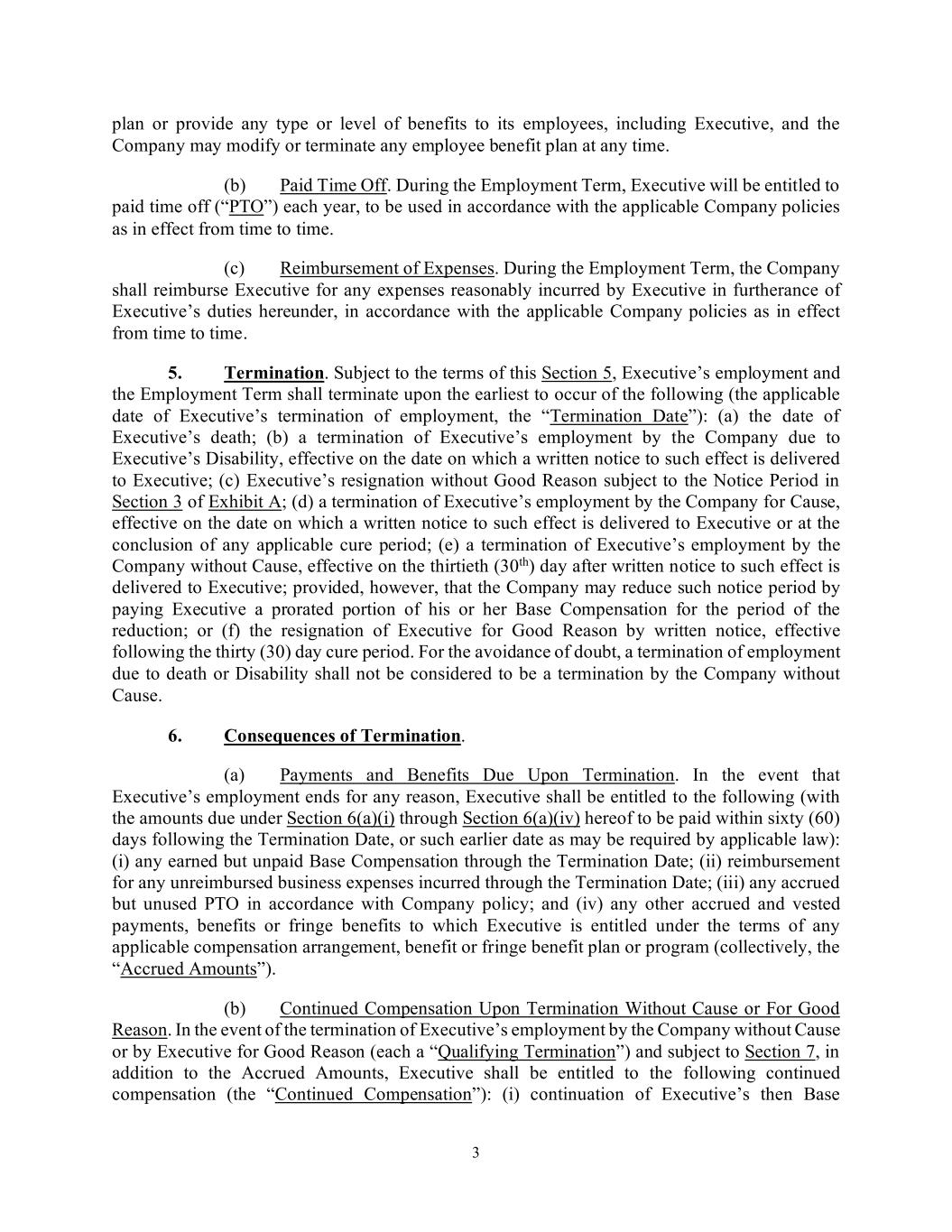 3 plan or provide any type or level of benefits to its employees, including Executive, and the Company may modify or terminate any employee benefit plan at any time. (b) Paid Time Off. During the Employment Term, Executive will be entitled to paid time off (“PTO”) each year, to be used in accordance with the applicable Company policies as in effect from time to time. (c) Reimbursement of Expenses. During the Employment Term, the Company shall reimburse Executive for any expenses reasonably incurred by Executive in furtherance of Executive’s duties hereunder, in accordance with the applicable Company policies as in effect from time to time. 5. Termination. Subject to the terms of this Section 5, Executive’s employment and the Employment Term shall terminate upon the earliest to occur of the following (the applicable date of Executive’s termination of employment, the “Termination Date”): (a) the date of Executive’s death; (b) a termination of Executive’s employment by the Company due to Executive’s Disability, effective on the date on which a written notice to such effect is delivered to Executive; (c) Executive’s resignation without Good Reason subject to the Notice Period in Section 3 of Exhibit A; (d) a termination of Executive’s employment by the Company for Cause, effective on the date on which a written notice to such effect is delivered to Executive or at the conclusion of any applicable cure period; (e) a termination of Executive’s employment by the Company without Cause, effective on the thirtieth (30th) day after written notice to such effect is delivered to Executive; provided, however, that the Company may reduce such notice period by paying Executive a prorated portion of his or her Base Compensation for the period of the reduction; or (f) the resignation of Executive for Good Reason by written notice, effective following the thirty (30) day cure period. For the avoidance of doubt, a termination of employment due to death or Disability shall not be considered to be a termination by the Company without Cause. 6. Consequences of Termination. (a) Payments and Benefits Due Upon Termination. In the event that Executive’s employment ends for any reason, Executive shall be entitled to the following (with the amounts due under Section 6(a)(i) through Section 6(a)(iv) hereof to be paid within sixty (60) days following the Termination Date, or such earlier date as may be required by applicable law): (i) any earned but unpaid Base Compensation through the Termination Date; (ii) reimbursement for any unreimbursed business expenses incurred through the Termination Date; (iii) any accrued but unused PTO in accordance with Company policy; and (iv) any other accrued and vested payments, benefits or fringe benefits to which Executive is entitled under the terms of any applicable compensation arrangement, benefit or fringe benefit plan or program (collectively, the “Accrued Amounts”). (b) Continued Compensation Upon Termination Without Cause or For Good Reason. In the event of the termination of Executive’s employment by the Company without Cause or by Executive for Good Reason (each a “Qualifying Termination”) and subject to Section 7, in addition to the Accrued Amounts, Executive shall be entitled to the following continued compensation (the “Continued Compensation”): (i) continuation of Executive’s then Base