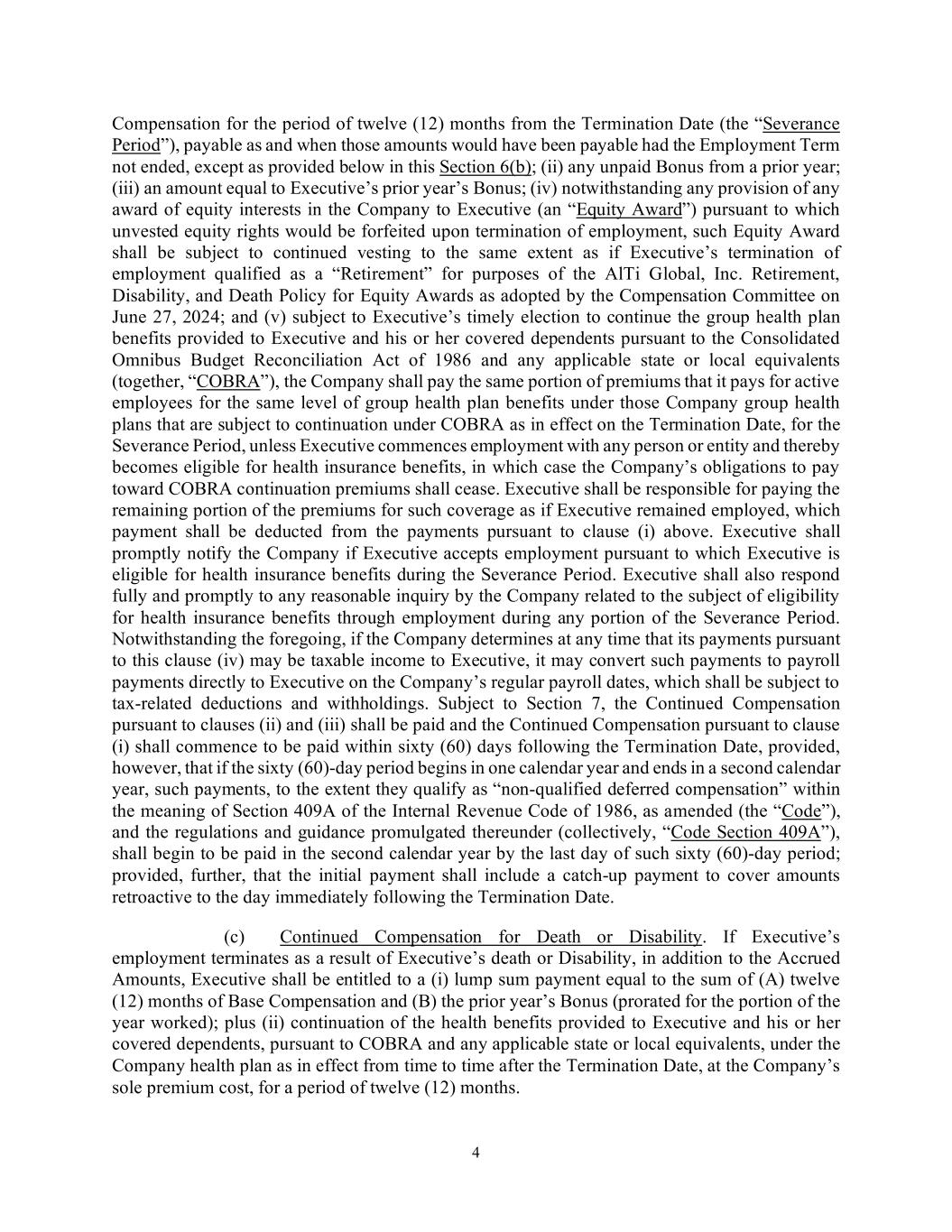 4 Compensation for the period of twelve (12) months from the Termination Date (the “Severance Period”), payable as and when those amounts would have been payable had the Employment Term not ended, except as provided below in this Section 6(b); (ii) any unpaid Bonus from a prior year; (iii) an amount equal to Executive’s prior year’s Bonus; (iv) notwithstanding any provision of any award of equity interests in the Company to Executive (an “Equity Award”) pursuant to which unvested equity rights would be forfeited upon termination of employment, such Equity Award shall be subject to continued vesting to the same extent as if Executive’s termination of employment qualified as a “Retirement” for purposes of the AlTi Global, Inc. Retirement, Disability, and Death Policy for Equity Awards as adopted by the Compensation Committee on June 27, 2024; and (v) subject to Executive’s timely election to continue the group health plan benefits provided to Executive and his or her covered dependents pursuant to the Consolidated Omnibus Budget Reconciliation Act of 1986 and any applicable state or local equivalents (together, “COBRA”), the Company shall pay the same portion of premiums that it pays for active employees for the same level of group health plan benefits under those Company group health plans that are subject to continuation under COBRA as in effect on the Termination Date, for the Severance Period, unless Executive commences employment with any person or entity and thereby becomes eligible for health insurance benefits, in which case the Company’s obligations to pay toward COBRA continuation premiums shall cease. Executive shall be responsible for paying the remaining portion of the premiums for such coverage as if Executive remained employed, which payment shall be deducted from the payments pursuant to clause (i) above. Executive shall promptly notify the Company if Executive accepts employment pursuant to which Executive is eligible for health insurance benefits during the Severance Period. Executive shall also respond fully and promptly to any reasonable inquiry by the Company related to the subject of eligibility for health insurance benefits through employment during any portion of the Severance Period. Notwithstanding the foregoing, if the Company determines at any time that its payments pursuant to this clause (iv) may be taxable income to Executive, it may convert such payments to payroll payments directly to Executive on the Company’s regular payroll dates, which shall be subject to tax-related deductions and withholdings. Subject to Section 7, the Continued Compensation pursuant to clauses (ii) and (iii) shall be paid and the Continued Compensation pursuant to clause (i) shall commence to be paid within sixty (60) days following the Termination Date, provided, however, that if the sixty (60)-day period begins in one calendar year and ends in a second calendar year, such payments, to the extent they qualify as “non-qualified deferred compensation” within the meaning of Section 409A of the Internal Revenue Code of 1986, as amended (the “Code”), and the regulations and guidance promulgated thereunder (collectively, “Code Section 409A”), shall begin to be paid in the second calendar year by the last day of such sixty (60)-day period; provided, further, that the initial payment shall include a catch-up payment to cover amounts retroactive to the day immediately following the Termination Date. (c) Continued Compensation for Death or Disability. If Executive’s employment terminates as a result of Executive’s death or Disability, in addition to the Accrued Amounts, Executive shall be entitled to a (i) lump sum payment equal to the sum of (A) twelve (12) months of Base Compensation and (B) the prior year’s Bonus (prorated for the portion of the year worked); plus (ii) continuation of the health benefits provided to Executive and his or her covered dependents, pursuant to COBRA and any applicable state or local equivalents, under the Company health plan as in effect from time to time after the Termination Date, at the Company’s sole premium cost, for a period of twelve (12) months.