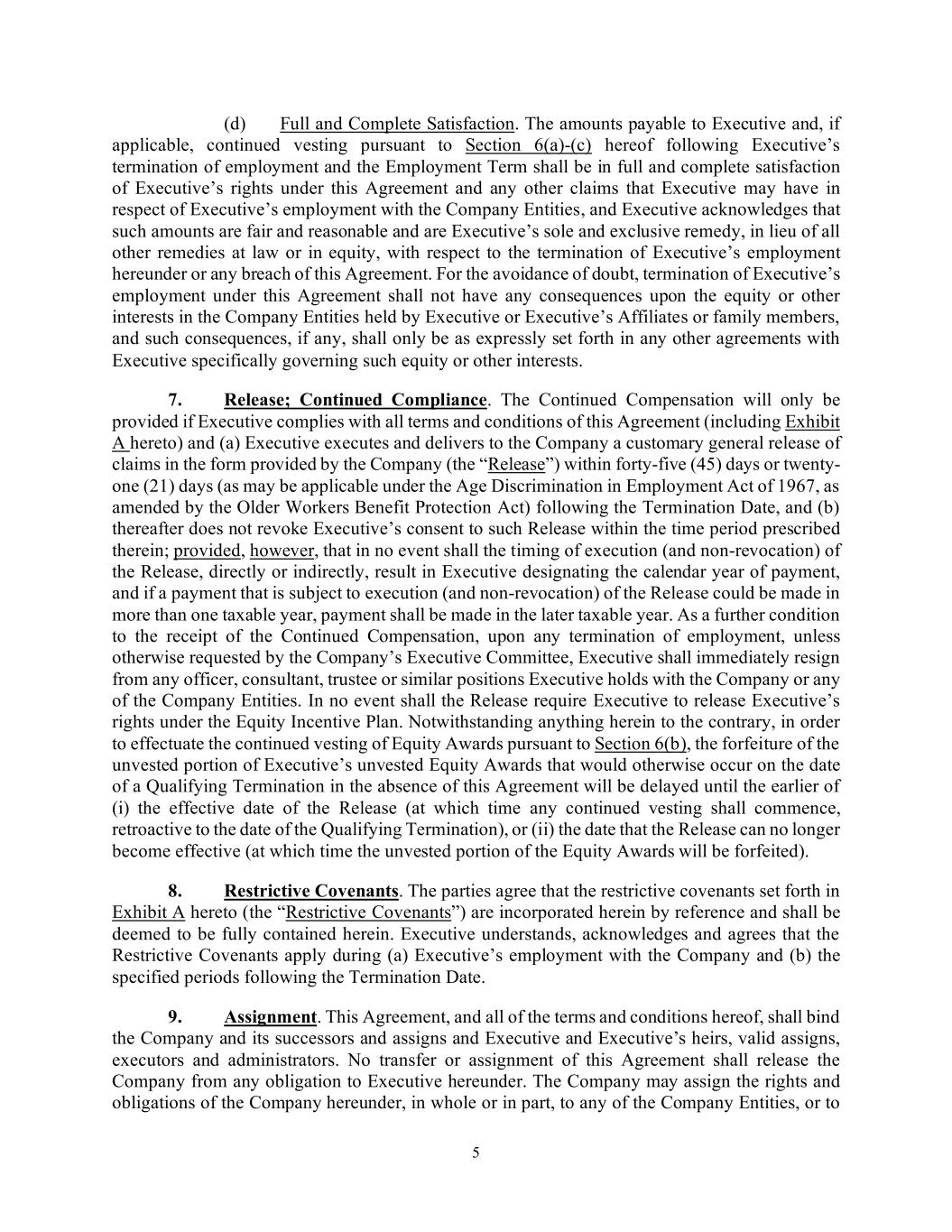 5 (d) Full and Complete Satisfaction. The amounts payable to Executive and, if applicable, continued vesting pursuant to Section 6(a)-(c) hereof following Executive’s termination of employment and the Employment Term shall be in full and complete satisfaction of Executive’s rights under this Agreement and any other claims that Executive may have in respect of Executive’s employment with the Company Entities, and Executive acknowledges that such amounts are fair and reasonable and are Executive’s sole and exclusive remedy, in lieu of all other remedies at law or in equity, with respect to the termination of Executive’s employment hereunder or any breach of this Agreement. For the avoidance of doubt, termination of Executive’s employment under this Agreement shall not have any consequences upon the equity or other interests in the Company Entities held by Executive or Executive’s Affiliates or family members, and such consequences, if any, shall only be as expressly set forth in any other agreements with Executive specifically governing such equity or other interests. 7. Release; Continued Compliance. The Continued Compensation will only be provided if Executive complies with all terms and conditions of this Agreement (including Exhibit A hereto) and (a) Executive executes and delivers to the Company a customary general release of claims in the form provided by the Company (the “Release”) within forty-five (45) days or twenty- one (21) days (as may be applicable under the Age Discrimination in Employment Act of 1967, as amended by the Older Workers Benefit Protection Act) following the Termination Date, and (b) thereafter does not revoke Executive’s consent to such Release within the time period prescribed therein; provided, however, that in no event shall the timing of execution (and non-revocation) of the Release, directly or indirectly, result in Executive designating the calendar year of payment, and if a payment that is subject to execution (and non-revocation) of the Release could be made in more than one taxable year, payment shall be made in the later taxable year. As a further condition to the receipt of the Continued Compensation, upon any termination of employment, unless otherwise requested by the Company’s Executive Committee, Executive shall immediately resign from any officer, consultant, trustee or similar positions Executive holds with the Company or any of the Company Entities. In no event shall the Release require Executive to release Executive’s rights under the Equity Incentive Plan. Notwithstanding anything herein to the contrary, in order to effectuate the continued vesting of Equity Awards pursuant to Section 6(b), the forfeiture of the unvested portion of Executive’s unvested Equity Awards that would otherwise occur on the date of a Qualifying Termination in the absence of this Agreement will be delayed until the earlier of (i) the effective date of the Release (at which time any continued vesting shall commence, retroactive to the date of the Qualifying Termination), or (ii) the date that the Release can no longer become effective (at which time the unvested portion of the Equity Awards will be forfeited). 8. Restrictive Covenants. The parties agree that the restrictive covenants set forth in Exhibit A hereto (the “Restrictive Covenants”) are incorporated herein by reference and shall be deemed to be fully contained herein. Executive understands, acknowledges and agrees that the Restrictive Covenants apply during (a) Executive’s employment with the Company and (b) the specified periods following the Termination Date. 9. Assignment. This Agreement, and all of the terms and conditions hereof, shall bind the Company and its successors and assigns and Executive and Executive’s heirs, valid assigns, executors and administrators. No transfer or assignment of this Agreement shall release the Company from any obligation to Executive hereunder. The Company may assign the rights and obligations of the Company hereunder, in whole or in part, to any of the Company Entities, or to