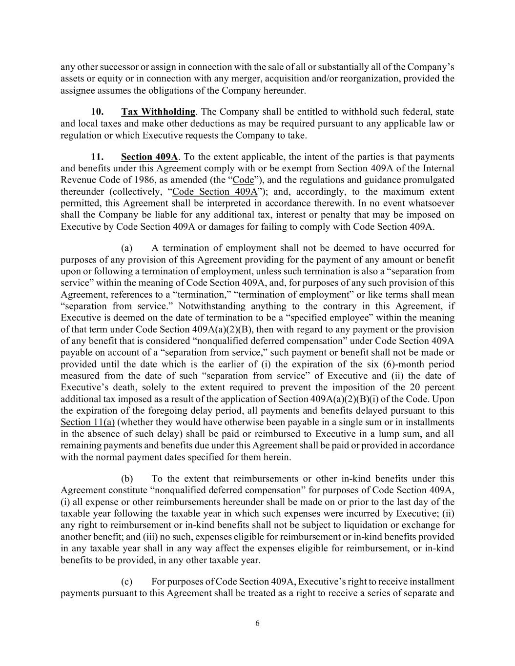 6 any other successor or assign in connection with the sale of all or substantially all of the Company’s assets or equity or in connection with any merger, acquisition and/or reorganization, provided the assignee assumes the obligations of the Company hereunder. 10. Tax Withholding. The Company shall be entitled to withhold such federal, state and local taxes and make other deductions as may be required pursuant to any applicable law or regulation or which Executive requests the Company to take. 11. Section 409A. To the extent applicable, the intent of the parties is that payments and benefits under this Agreement comply with or be exempt from Section 409A of the Internal Revenue Code of 1986, as amended (the “Code”), and the regulations and guidance promulgated thereunder (collectively, “Code Section 409A”); and, accordingly, to the maximum extent permitted, this Agreement shall be interpreted in accordance therewith. In no event whatsoever shall the Company be liable for any additional tax, interest or penalty that may be imposed on Executive by Code Section 409A or damages for failing to comply with Code Section 409A. (a) A termination of employment shall not be deemed to have occurred for purposes of any provision of this Agreement providing for the payment of any amount or benefit upon or following a termination of employment, unless such termination is also a “separation from service” within the meaning of Code Section 409A, and, for purposes of any such provision of this Agreement, references to a “termination,” “termination of employment” or like terms shall mean “separation from service.” Notwithstanding anything to the contrary in this Agreement, if Executive is deemed on the date of termination to be a “specified employee” within the meaning of that term under Code Section 409A(a)(2)(B), then with regard to any payment or the provision of any benefit that is considered “nonqualified deferred compensation” under Code Section 409A payable on account of a “separation from service,” such payment or benefit shall not be made or provided until the date which is the earlier of (i) the expiration of the six (6)-month period measured from the date of such “separation from service” of Executive and (ii) the date of Executive’s death, solely to the extent required to prevent the imposition of the 20 percent additional tax imposed as a result of the application of Section 409A(a)(2)(B)(i) of the Code. Upon the expiration of the foregoing delay period, all payments and benefits delayed pursuant to this Section 11(a) (whether they would have otherwise been payable in a single sum or in installments in the absence of such delay) shall be paid or reimbursed to Executive in a lump sum, and all remaining payments and benefits due under this Agreement shall be paid or provided in accordance with the normal payment dates specified for them herein. (b) To the extent that reimbursements or other in-kind benefits under this Agreement constitute “nonqualified deferred compensation” for purposes of Code Section 409A, (i) all expense or other reimbursements hereunder shall be made on or prior to the last day of the taxable year following the taxable year in which such expenses were incurred by Executive; (ii) any right to reimbursement or in-kind benefits shall not be subject to liquidation or exchange for another benefit; and (iii) no such, expenses eligible for reimbursement or in-kind benefits provided in any taxable year shall in any way affect the expenses eligible for reimbursement, or in-kind benefits to be provided, in any other taxable year. (c) For purposes of Code Section 409A, Executive’s right to receive installment payments pursuant to this Agreement shall be treated as a right to receive a series of separate and