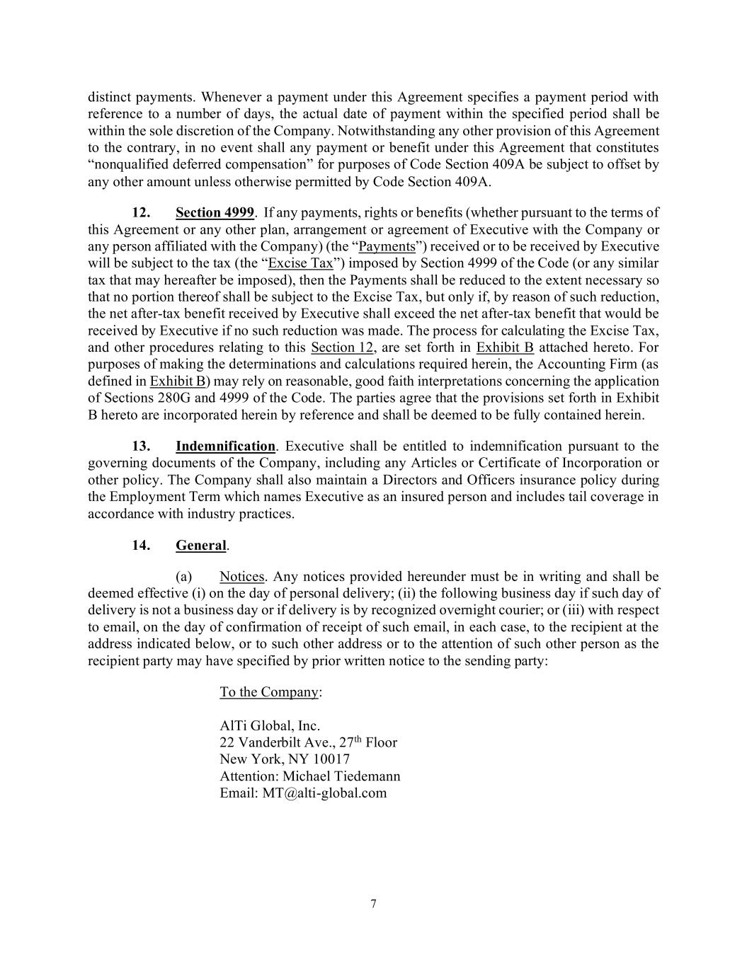 7 distinct payments. Whenever a payment under this Agreement specifies a payment period with reference to a number of days, the actual date of payment within the specified period shall be within the sole discretion of the Company. Notwithstanding any other provision of this Agreement to the contrary, in no event shall any payment or benefit under this Agreement that constitutes “nonqualified deferred compensation” for purposes of Code Section 409A be subject to offset by any other amount unless otherwise permitted by Code Section 409A. 12. Section 4999. If any payments, rights or benefits (whether pursuant to the terms of this Agreement or any other plan, arrangement or agreement of Executive with the Company or any person affiliated with the Company) (the “Payments”) received or to be received by Executive will be subject to the tax (the “Excise Tax”) imposed by Section 4999 of the Code (or any similar tax that may hereafter be imposed), then the Payments shall be reduced to the extent necessary so that no portion thereof shall be subject to the Excise Tax, but only if, by reason of such reduction, the net after-tax benefit received by Executive shall exceed the net after-tax benefit that would be received by Executive if no such reduction was made. The process for calculating the Excise Tax, and other procedures relating to this Section 12, are set forth in Exhibit B attached hereto. For purposes of making the determinations and calculations required herein, the Accounting Firm (as defined in Exhibit B) may rely on reasonable, good faith interpretations concerning the application of Sections 280G and 4999 of the Code. The parties agree that the provisions set forth in Exhibit B hereto are incorporated herein by reference and shall be deemed to be fully contained herein. 13. Indemnification. Executive shall be entitled to indemnification pursuant to the governing documents of the Company, including any Articles or Certificate of Incorporation or other policy. The Company shall also maintain a Directors and Officers insurance policy during the Employment Term which names Executive as an insured person and includes tail coverage in accordance with industry practices. 14. General. (a) Notices. Any notices provided hereunder must be in writing and shall be deemed effective (i) on the day of personal delivery; (ii) the following business day if such day of delivery is not a business day or if delivery is by recognized overnight courier; or (iii) with respect to email, on the day of confirmation of receipt of such email, in each case, to the recipient at the address indicated below, or to such other address or to the attention of such other person as the recipient party may have specified by prior written notice to the sending party: To the Company: AlTi Global, Inc. 22 Vanderbilt Ave., 27th Floor New York, NY 10017 Attention: Michael Tiedemann Email: MT@alti-global.com