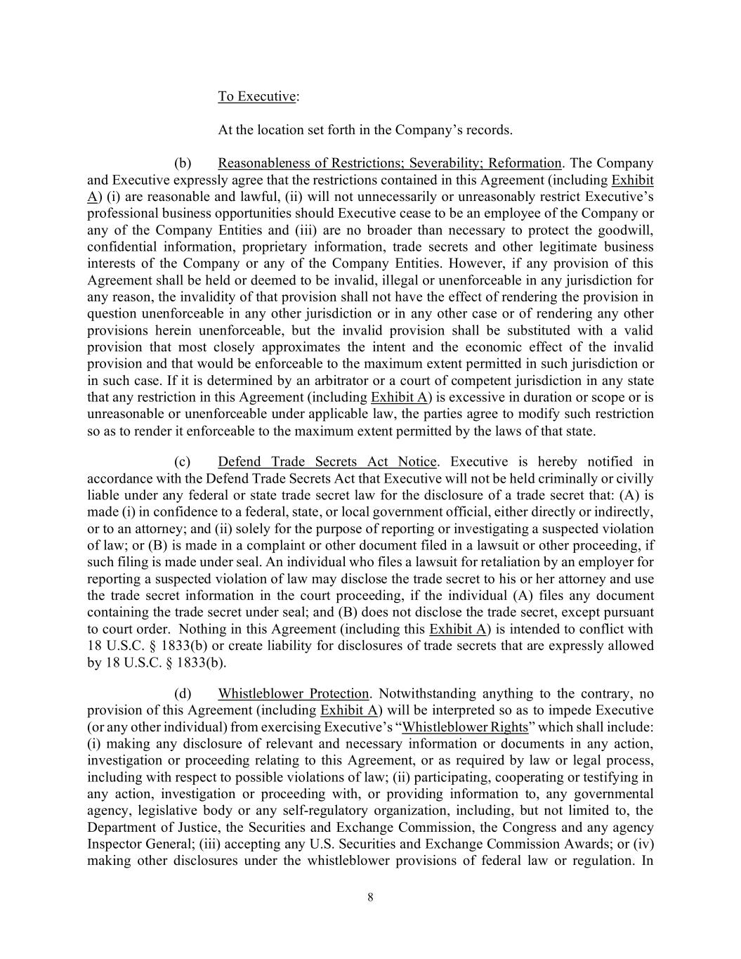 8 To Executive: At the location set forth in the Company’s records. (b) Reasonableness of Restrictions; Severability; Reformation. The Company and Executive expressly agree that the restrictions contained in this Agreement (including Exhibit A) (i) are reasonable and lawful, (ii) will not unnecessarily or unreasonably restrict Executive’s professional business opportunities should Executive cease to be an employee of the Company or any of the Company Entities and (iii) are no broader than necessary to protect the goodwill, confidential information, proprietary information, trade secrets and other legitimate business interests of the Company or any of the Company Entities. However, if any provision of this Agreement shall be held or deemed to be invalid, illegal or unenforceable in any jurisdiction for any reason, the invalidity of that provision shall not have the effect of rendering the provision in question unenforceable in any other jurisdiction or in any other case or of rendering any other provisions herein unenforceable, but the invalid provision shall be substituted with a valid provision that most closely approximates the intent and the economic effect of the invalid provision and that would be enforceable to the maximum extent permitted in such jurisdiction or in such case. If it is determined by an arbitrator or a court of competent jurisdiction in any state that any restriction in this Agreement (including Exhibit A) is excessive in duration or scope or is unreasonable or unenforceable under applicable law, the parties agree to modify such restriction so as to render it enforceable to the maximum extent permitted by the laws of that state. (c) Defend Trade Secrets Act Notice. Executive is hereby notified in accordance with the Defend Trade Secrets Act that Executive will not be held criminally or civilly liable under any federal or state trade secret law for the disclosure of a trade secret that: (A) is made (i) in confidence to a federal, state, or local government official, either directly or indirectly, or to an attorney; and (ii) solely for the purpose of reporting or investigating a suspected violation of law; or (B) is made in a complaint or other document filed in a lawsuit or other proceeding, if such filing is made under seal. An individual who files a lawsuit for retaliation by an employer for reporting a suspected violation of law may disclose the trade secret to his or her attorney and use the trade secret information in the court proceeding, if the individual (A) files any document containing the trade secret under seal; and (B) does not disclose the trade secret, except pursuant to court order. Nothing in this Agreement (including this Exhibit A) is intended to conflict with 18 U.S.C. § 1833(b) or create liability for disclosures of trade secrets that are expressly allowed by 18 U.S.C. § 1833(b). (d) Whistleblower Protection. Notwithstanding anything to the contrary, no provision of this Agreement (including Exhibit A) will be interpreted so as to impede Executive (or any other individual) from exercising Executive’s “Whistleblower Rights” which shall include: (i) making any disclosure of relevant and necessary information or documents in any action, investigation or proceeding relating to this Agreement, or as required by law or legal process, including with respect to possible violations of law; (ii) participating, cooperating or testifying in any action, investigation or proceeding with, or providing information to, any governmental agency, legislative body or any self-regulatory organization, including, but not limited to, the Department of Justice, the Securities and Exchange Commission, the Congress and any agency Inspector General; (iii) accepting any U.S. Securities and Exchange Commission Awards; or (iv) making other disclosures under the whistleblower provisions of federal law or regulation. In