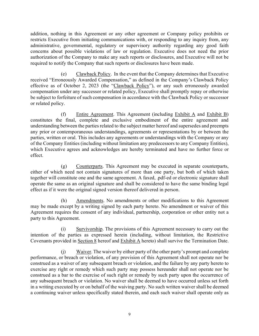 9 addition, nothing in this Agreement or any other agreement or Company policy prohibits or restricts Executive from initiating communications with, or responding to any inquiry from, any administrative, governmental, regulatory or supervisory authority regarding any good faith concerns about possible violations of law or regulation. Executive does not need the prior authorization of the Company to make any such reports or disclosures, and Executive will not be required to notify the Company that such reports or disclosures have been made. (e) Clawback Policy. In the event that the Company determines that Executive received “Erroneously Awarded Compensation,” as defined in the Company’s Clawback Policy effective as of October 2, 2023 (the “Clawback Policy”), or any such erroneously awarded compensation under any successor or related policy, Executive shall promptly repay or otherwise be subject to forfeiture of such compensation in accordance with the Clawback Policy or successor or related policy. (f) Entire Agreement. This Agreement (including Exhibit A and Exhibit B) constitutes the final, complete and exclusive embodiment of the entire agreement and understanding between the parties related to the subject matter hereof and supersedes and preempts any prior or contemporaneous understandings, agreements or representations by or between the parties, written or oral. This includes any agreements or understandings with the Company or any of the Company Entities (including without limitation any predecessors to any Company Entities), which Executive agrees and acknowledges are hereby terminated and have no further force or effect. (g) Counterparts. This Agreement may be executed in separate counterparts, either of which need not contain signatures of more than one party, but both of which taken together will constitute one and the same agreement. A faxed, .pdf-ed or electronic signature shall operate the same as an original signature and shall be considered to have the same binding legal effect as if it were the original signed version thereof delivered in person. (h) Amendments. No amendments or other modifications to this Agreement may be made except by a writing signed by each party hereto. No amendment or waiver of this Agreement requires the consent of any individual, partnership, corporation or other entity not a party to this Agreement. (i) Survivorship. The provisions of this Agreement necessary to carry out the intention of the parties as expressed herein (including, without limitation, the Restrictive Covenants provided in Section 8 hereof and Exhibit A hereto) shall survive the Termination Date. (j) Waiver. The waiver by either party of the other party’s prompt and complete performance, or breach or violation, of any provision of this Agreement shall not operate nor be construed as a waiver of any subsequent breach or violation, and the failure by any party hereto to exercise any right or remedy which such party may possess hereunder shall not operate nor be construed as a bar to the exercise of such right or remedy by such party upon the occurrence of any subsequent breach or violation. No waiver shall be deemed to have occurred unless set forth in a writing executed by or on behalf of the waiving party. No such written waiver shall be deemed a continuing waiver unless specifically stated therein, and each such waiver shall operate only as