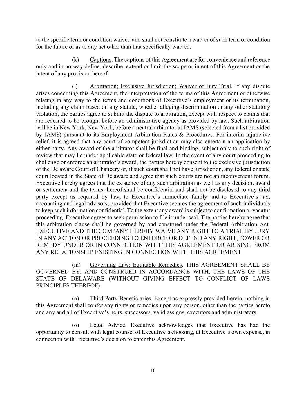 10 to the specific term or condition waived and shall not constitute a waiver of such term or condition for the future or as to any act other than that specifically waived. (k) Captions. The captions of this Agreement are for convenience and reference only and in no way define, describe, extend or limit the scope or intent of this Agreement or the intent of any provision hereof. (l) Arbitration; Exclusive Jurisdiction; Waiver of Jury Trial. If any dispute arises concerning this Agreement, the interpretation of the terms of this Agreement or otherwise relating in any way to the terms and conditions of Executive’s employment or its termination, including any claim based on any statute, whether alleging discrimination or any other statutory violation, the parties agree to submit the dispute to arbitration, except with respect to claims that are required to be brought before an administrative agency as provided by law. Such arbitration will be in New York, New York, before a neutral arbitrator at JAMS (selected from a list provided by JAMS) pursuant to its Employment Arbitration Rules & Procedures. For interim injunctive relief, it is agreed that any court of competent jurisdiction may also entertain an application by either party. Any award of the arbitrator shall be final and binding, subject only to such right of review that may lie under applicable state or federal law. In the event of any court proceeding to challenge or enforce an arbitrator’s award, the parties hereby consent to the exclusive jurisdiction of the Delaware Court of Chancery or, if such court shall not have jurisdiction, any federal or state court located in the State of Delaware and agree that such courts are not an inconvenient forum. Executive hereby agrees that the existence of any such arbitration as well as any decision, award or settlement and the terms thereof shall be confidential and shall not be disclosed to any third party except as required by law, to Executive’s immediate family and to Executive’s tax, accounting and legal advisors, provided that Executive secures the agreement of such individuals to keep such information confidential. To the extent any award is subject to confirmation or vacatur proceeding, Executive agrees to seek permission to file it under seal. The parties hereby agree that this arbitration clause shall be governed by and construed under the Federal Arbitration Act. EXECUTIVE AND THE COMPANY HEREBY WAIVE ANY RIGHT TO A TRIAL BY JURY IN ANY ACTION OR PROCEEDING TO ENFORCE OR DEFEND ANY RIGHT, POWER OR REMEDY UNDER OR IN CONNECTION WITH THIS AGREEMENT OR ARISING FROM ANY RELATIONSHIP EXISTING IN CONNECTION WITH THIS AGREEMENT. (m) Governing Law; Equitable Remedies. THIS AGREEMENT SHALL BE GOVERNED BY, AND CONSTRUED IN ACCORDANCE WITH, THE LAWS OF THE STATE OF DELAWARE (WITHOUT GIVING EFFECT TO CONFLICT OF LAWS PRINCIPLES THEREOF). (n) Third Party Beneficiaries. Except as expressly provided herein, nothing in this Agreement shall confer any rights or remedies upon any person, other than the parties hereto and any and all of Executive’s heirs, successors, valid assigns, executors and administrators. (o) Legal Advice. Executive acknowledges that Executive has had the opportunity to consult with legal counsel of Executive’s choosing, at Executive’s own expense, in connection with Executive’s decision to enter this Agreement.