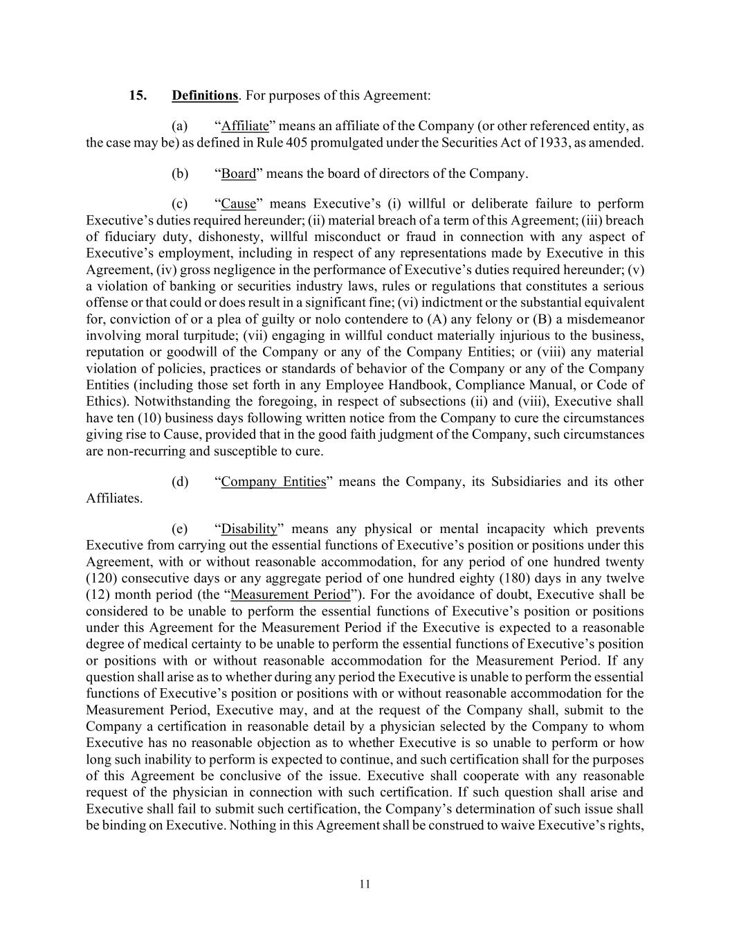 11 15. Definitions. For purposes of this Agreement: (a) “Affiliate” means an affiliate of the Company (or other referenced entity, as the case may be) as defined in Rule 405 promulgated under the Securities Act of 1933, as amended. (b) “Board” means the board of directors of the Company. (c) “Cause” means Executive’s (i) willful or deliberate failure to perform Executive’s duties required hereunder; (ii) material breach of a term of this Agreement; (iii) breach of fiduciary duty, dishonesty, willful misconduct or fraud in connection with any aspect of Executive’s employment, including in respect of any representations made by Executive in this Agreement, (iv) gross negligence in the performance of Executive’s duties required hereunder; (v) a violation of banking or securities industry laws, rules or regulations that constitutes a serious offense or that could or does result in a significant fine; (vi) indictment or the substantial equivalent for, conviction of or a plea of guilty or nolo contendere to (A) any felony or (B) a misdemeanor involving moral turpitude; (vii) engaging in willful conduct materially injurious to the business, reputation or goodwill of the Company or any of the Company Entities; or (viii) any material violation of policies, practices or standards of behavior of the Company or any of the Company Entities (including those set forth in any Employee Handbook, Compliance Manual, or Code of Ethics). Notwithstanding the foregoing, in respect of subsections (ii) and (viii), Executive shall have ten (10) business days following written notice from the Company to cure the circumstances giving rise to Cause, provided that in the good faith judgment of the Company, such circumstances are non-recurring and susceptible to cure. (d) “Company Entities” means the Company, its Subsidiaries and its other Affiliates. (e) “Disability” means any physical or mental incapacity which prevents Executive from carrying out the essential functions of Executive’s position or positions under this Agreement, with or without reasonable accommodation, for any period of one hundred twenty (120) consecutive days or any aggregate period of one hundred eighty (180) days in any twelve (12) month period (the “Measurement Period”). For the avoidance of doubt, Executive shall be considered to be unable to perform the essential functions of Executive’s position or positions under this Agreement for the Measurement Period if the Executive is expected to a reasonable degree of medical certainty to be unable to perform the essential functions of Executive’s position or positions with or without reasonable accommodation for the Measurement Period. If any question shall arise as to whether during any period the Executive is unable to perform the essential functions of Executive’s position or positions with or without reasonable accommodation for the Measurement Period, Executive may, and at the request of the Company shall, submit to the Company a certification in reasonable detail by a physician selected by the Company to whom Executive has no reasonable objection as to whether Executive is so unable to perform or how long such inability to perform is expected to continue, and such certification shall for the purposes of this Agreement be conclusive of the issue. Executive shall cooperate with any reasonable request of the physician in connection with such certification. If such question shall arise and Executive shall fail to submit such certification, the Company’s determination of such issue shall be binding on Executive. Nothing in this Agreement shall be construed to waive Executive’s rights,