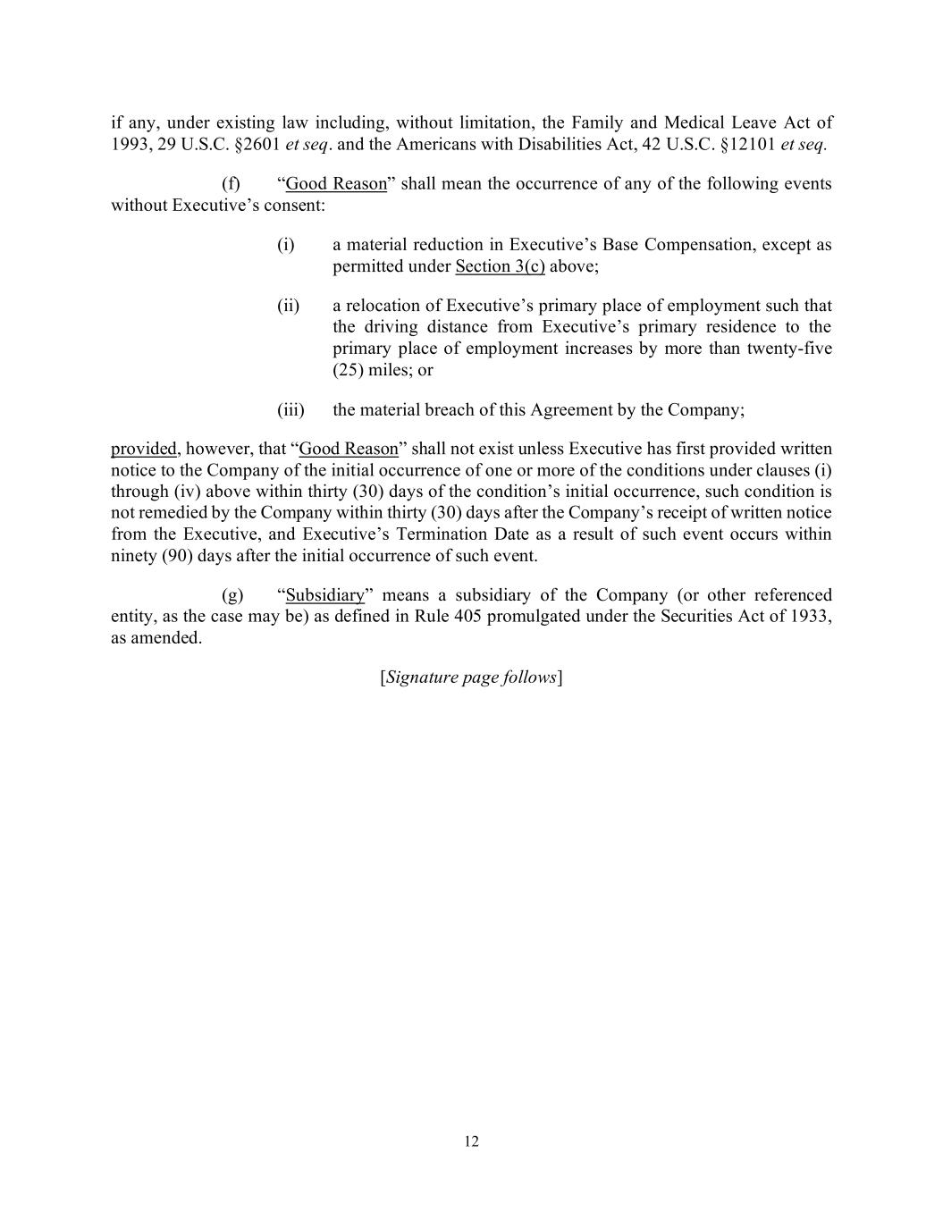 12 if any, under existing law including, without limitation, the Family and Medical Leave Act of 1993, 29 U.S.C. §2601 et seq. and the Americans with Disabilities Act, 42 U.S.C. §12101 et seq. (f) “Good Reason” shall mean the occurrence of any of the following events without Executive’s consent: (i) a material reduction in Executive’s Base Compensation, except as permitted under Section 3(c) above; (ii) a relocation of Executive’s primary place of employment such that the driving distance from Executive’s primary residence to the primary place of employment increases by more than twenty-five (25) miles; or (iii) the material breach of this Agreement by the Company; provided, however, that “Good Reason” shall not exist unless Executive has first provided written notice to the Company of the initial occurrence of one or more of the conditions under clauses (i) through (iv) above within thirty (30) days of the condition’s initial occurrence, such condition is not remedied by the Company within thirty (30) days after the Company’s receipt of written notice from the Executive, and Executive’s Termination Date as a result of such event occurs within ninety (90) days after the initial occurrence of such event. (g) “Subsidiary” means a subsidiary of the Company (or other referenced entity, as the case may be) as defined in Rule 405 promulgated under the Securities Act of 1933, as amended. [Signature page follows]