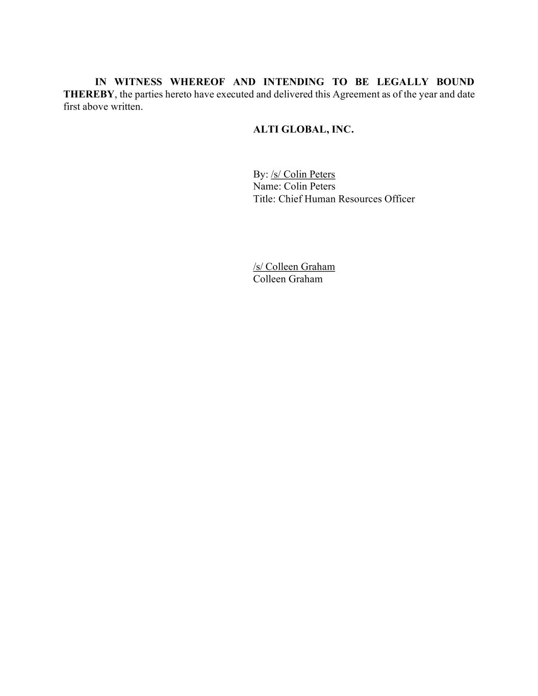 IN WITNESS WHEREOF AND INTENDING TO BE LEGALLY BOUND THEREBY, the parties hereto have executed and delivered this Agreement as of the year and date first above written. ALTI GLOBAL, INC. By: /s/ Colin Peters Name: Colin Peters Title: Chief Human Resources Officer /s/ Colleen Graham Colleen Graham