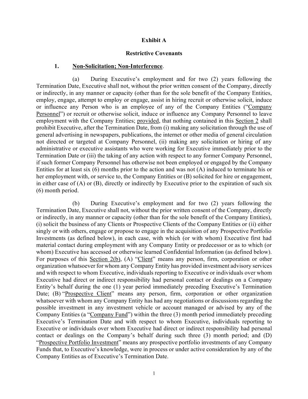 1 Exhibit A Restrictive Covenants 1. Non-Solicitation; Non-Interference. (a) During Executive’s employment and for two (2) years following the Termination Date, Executive shall not, without the prior written consent of the Company, directly or indirectly, in any manner or capacity (other than for the sole benefit of the Company Entities, employ, engage, attempt to employ or engage, assist in hiring recruit or otherwise solicit, induce or influence any Person who is an employee of any of the Company Entities (“Company Personnel”) or recruit or otherwise solicit, induce or influence any Company Personnel to leave employment with the Company Entities; provided, that nothing contained in this Section 2 shall prohibit Executive, after the Termination Date, from (i) making any solicitation through the use of general advertising in newspapers, publications, the internet or other media of general circulation not directed or targeted at Company Personnel, (ii) making any solicitation or hiring of any administrative or executive assistants who were working for Executive immediately prior to the Termination Date or (iii) the taking of any action with respect to any former Company Personnel, if such former Company Personnel has otherwise not been employed or engaged by the Company Entities for at least six (6) months prior to the action and was not (A) induced to terminate his or her employment with, or service to, the Company Entities or (B) solicited for hire or engagement, in either case of (A) or (B), directly or indirectly by Executive prior to the expiration of such six (6) month period. (b) During Executive’s employment and for two (2) years following the Termination Date, Executive shall not, without the prior written consent of the Company, directly or indirectly, in any manner or capacity (other than for the sole benefit of the Company Entities), (i) solicit the business of any Clients or Prospective Clients of the Company Entities or (ii) either singly or with others, engage or propose to engage in the acquisition of any Prospective Portfolio Investments (as defined below), in each case, with which (or with whom) Executive first had material contact during employment with any Company Entity or predecessor or as to which (or whom) Executive has accessed or otherwise learned Confidential Information (as defined below). For purposes of this Section 2(b), (A) “Client” means any person, firm, corporation or other organization whatsoever for whom any Company Entity has provided investment advisory services and with respect to whom Executive, individuals reporting to Executive or individuals over whom Executive had direct or indirect responsibility had personal contact or dealings on a Company Entity’s behalf during the one (1) year period immediately preceding Executive’s Termination Date; (B) “Prospective Client” means any person, firm, corporation or other organization whatsoever with whom any Company Entity has had any negotiations or discussions regarding the possible investment in any investment vehicle or account managed or advised by any of the Company Entities (a “Company Fund”) within the three (3) month period immediately preceding Executive’s Termination Date and with respect to whom Executive, individuals reporting to Executive or individuals over whom Executive had direct or indirect responsibility had personal contact or dealings on the Company’s behalf during such three (3) month period; and (D) “Prospective Portfolio Investment” means any prospective portfolio investments of any Company Funds that, to Executive’s knowledge, were in process or under active consideration by any of the Company Entities as of Executive’s Termination Date.
